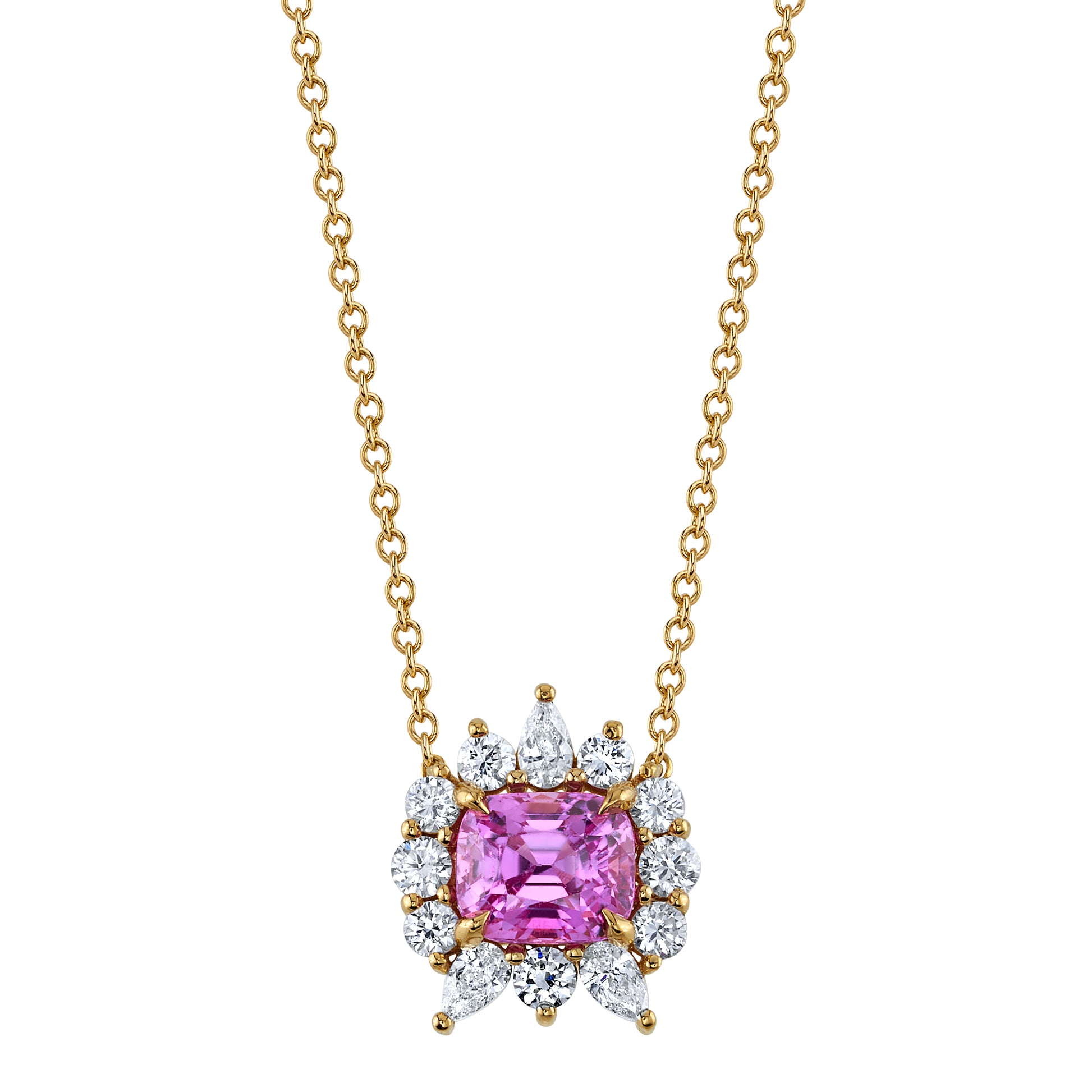 Hot pink Unheated Sapphires are hard to pass up when we are viewing them. This one was no exception. We designed a halo consisting of round and pear shaped diamonds configured in a way that frames the sapphire beautifully. At just over 1 carat for the center and the addded halo, the size is perfect to layer with other necklaces or, stand alone.