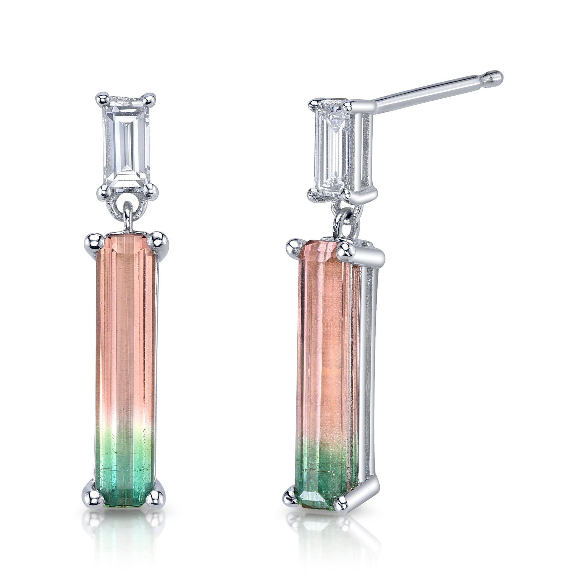 1.26cts Untreated Watermelon Tourmaline and Baguette Diamond dangle earrings in 18k white gold.