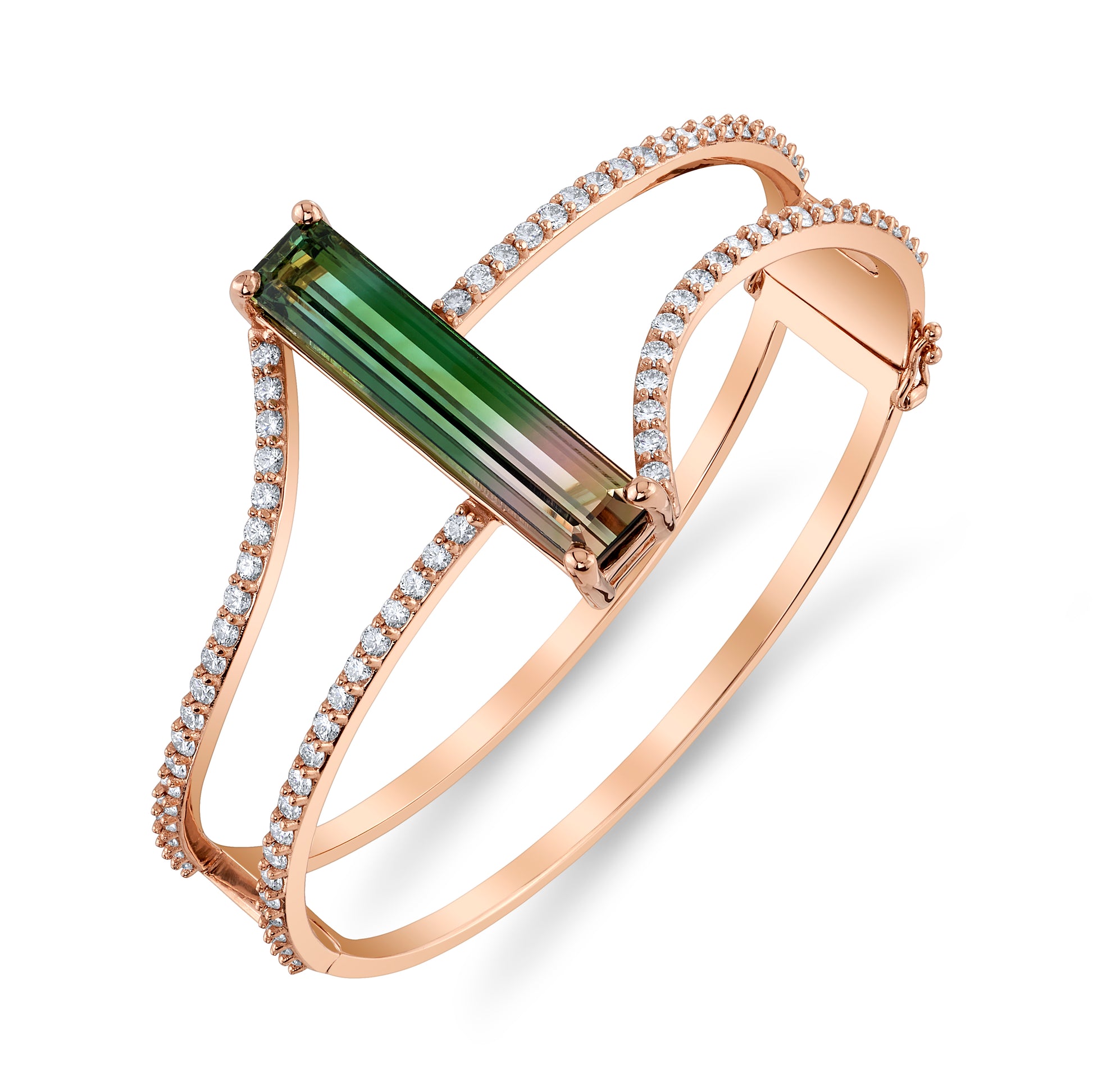 12.5ct Untreated African Bi-Color Tourmaline Hinged Bangle Cuff with natural diamond accents. This magnificent bangle is an award winning piece of jewelry, and was selected for the Retailers Choice Award in "Best Bangle over $5,000" category by the In Store Design awards competition 2024.