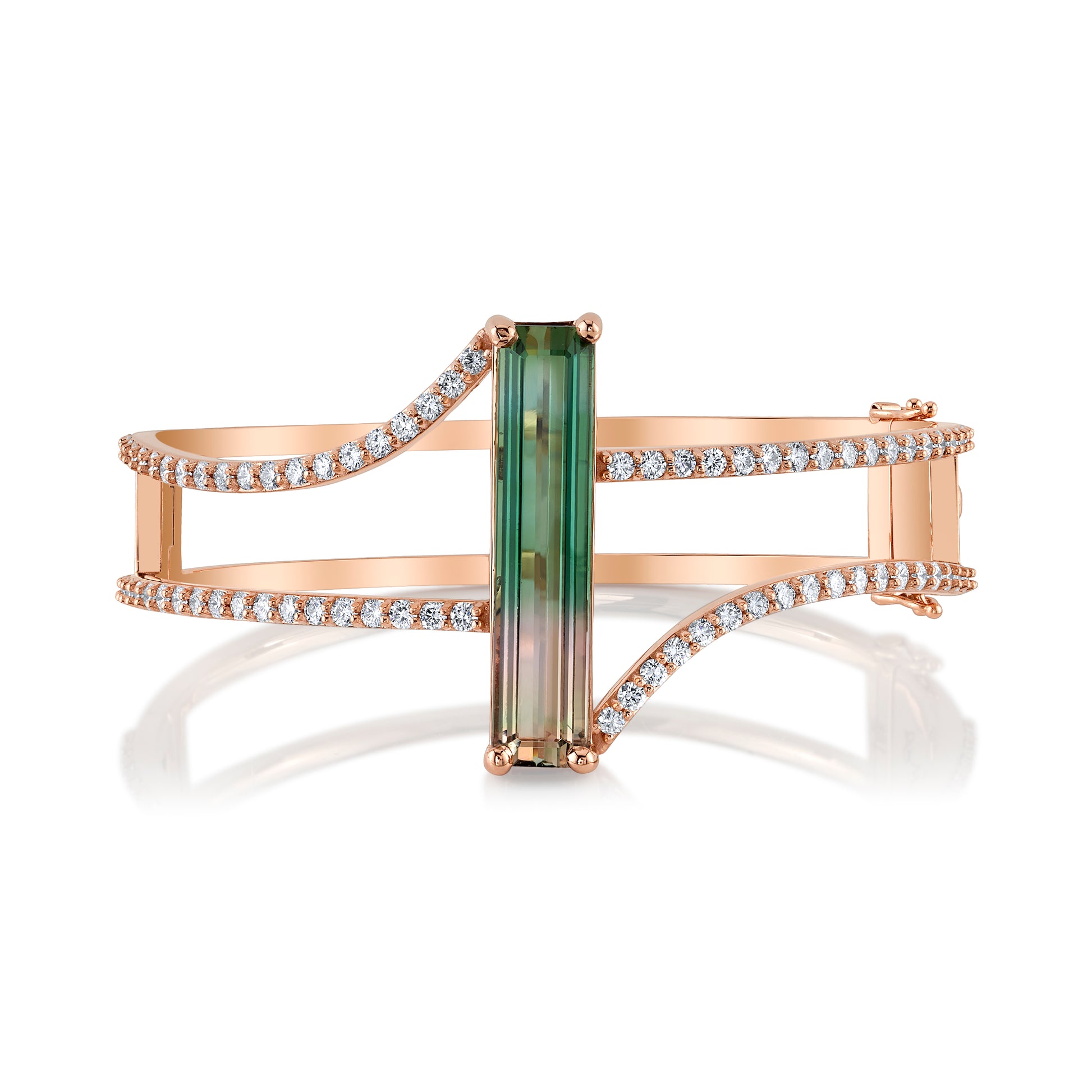 This tourmaline is a rarity due to the size and color of it. At over 12 carats, its elongated cut is striking. We designed the bangle with swooping arms to reach each end of the stone to make a beautiful diamond frame. On the wrist, it's presence is made clear!
