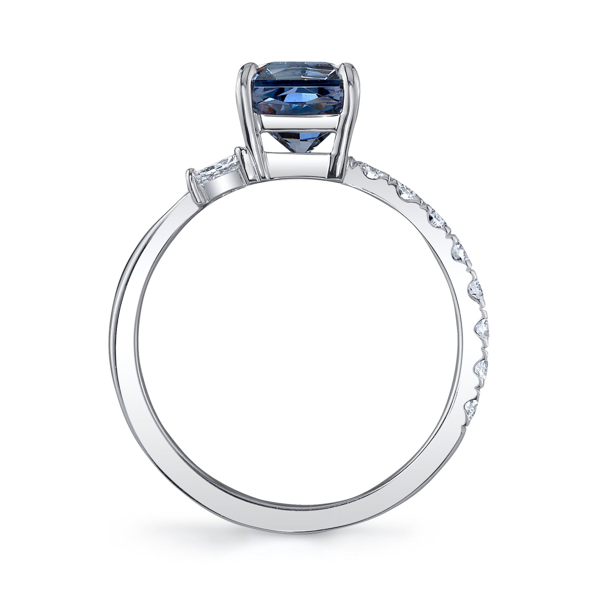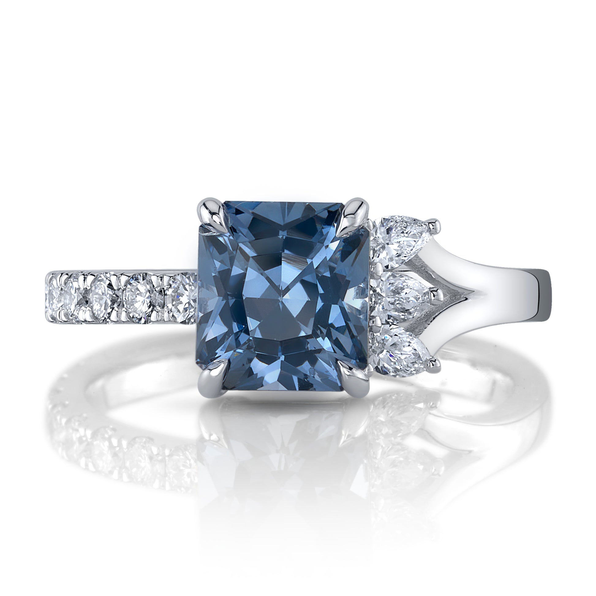 Assymetrical in design, a stunning radiant cut natural blue spinel over 2 carats steals the show. A trio of Pear shaped diamonds on one side peaks interest.