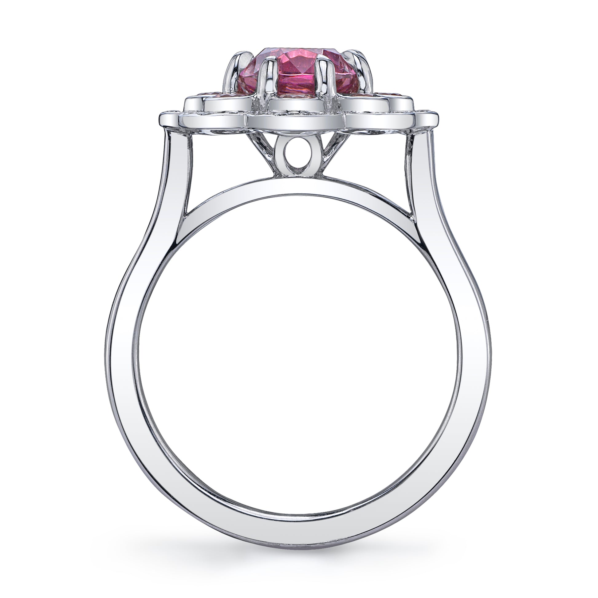 2.20ct Untreated Lotus Pink Garnet Oval ring in 18k white gold with floral diamond and pink spinel halo.