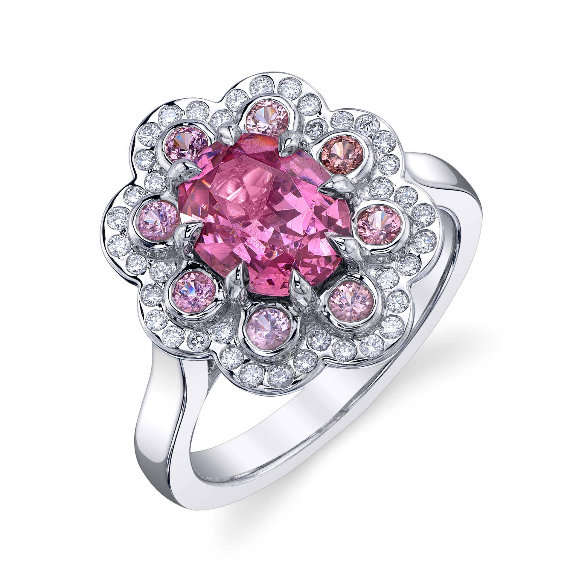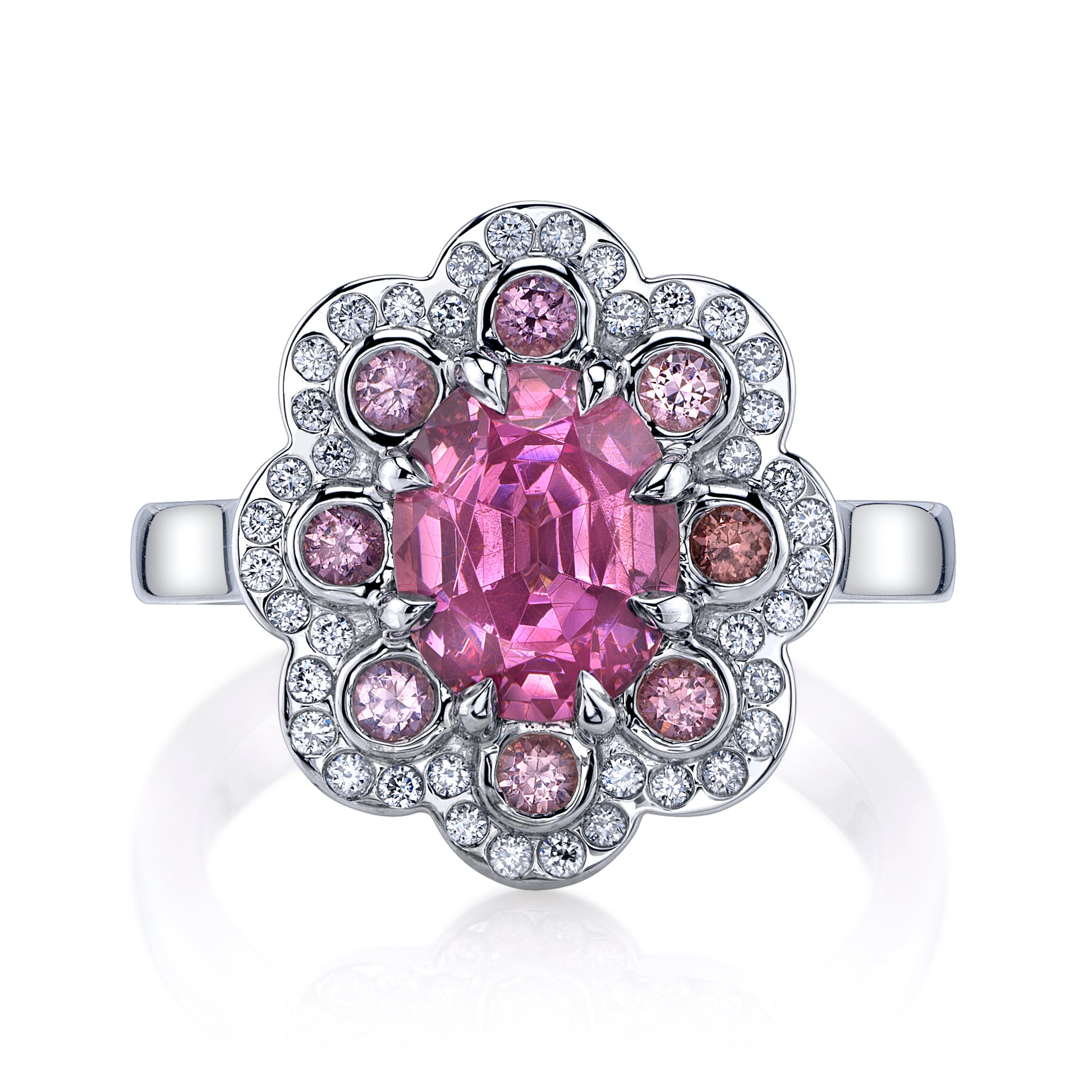 Exceptional pink garnet "Lotus" color. Lotus garnet was discovered in late 2015 in Northern Tanzania and exhibits a beautiful pink color with some orange undertones. We hand selected some orangey-pink spinels with slightly varying shades as you may see in the photos, on the very outskirts are natural round brilliant cut diamonds bringing the colors together in a floral inspired shape.