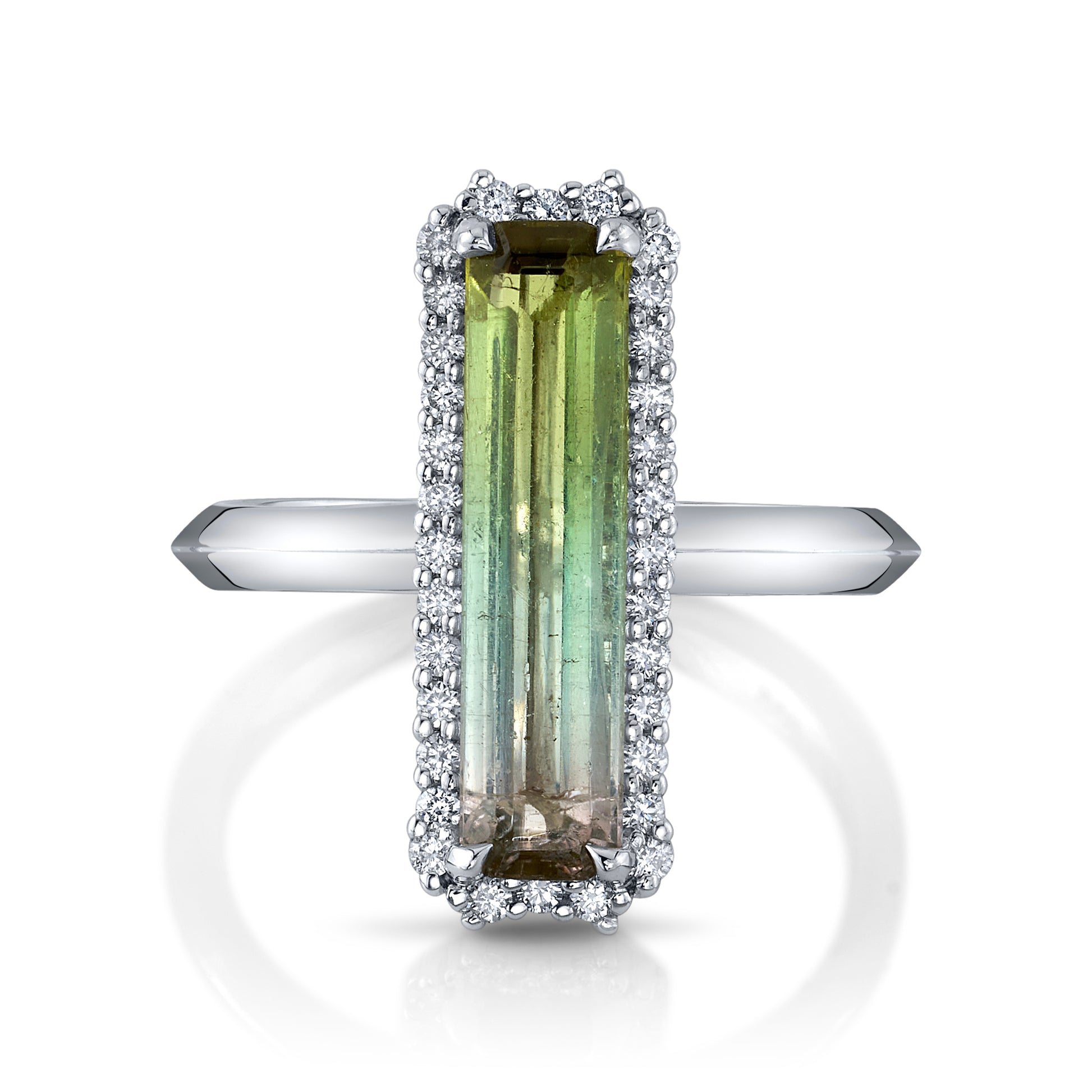 2.31cts No Heat Bi-Color Tourmaline Elongated cut ring, in 18k white gold with diamond halo.