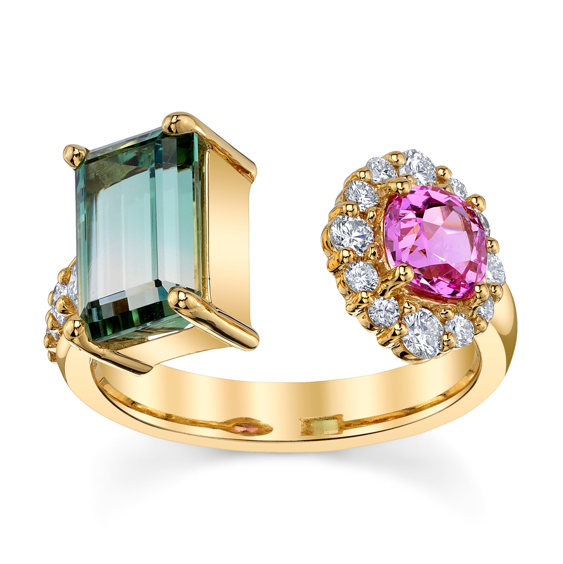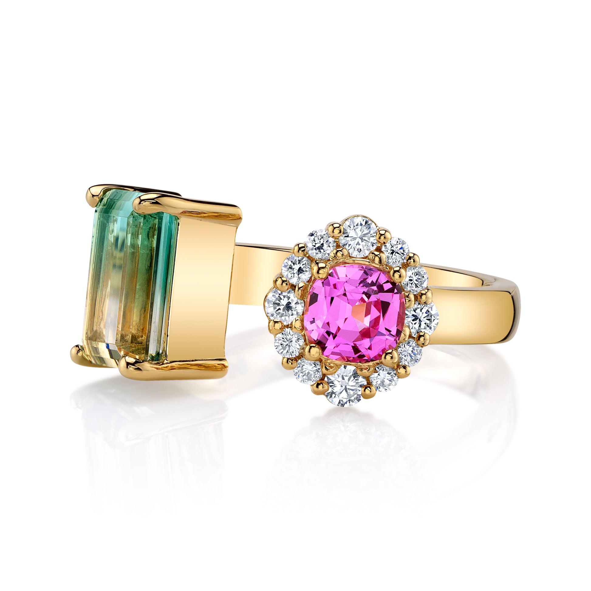 Make your own rules with this bold statement and pop of color. This open, cuff-style ring is powerful. On one side a bi color tourmaline with a minty green fade is accented with graduated diamonds on the foundation. On the other side is am absolute gem quality no heat pink sapphire cushion cut, surround by a graduating sized diamond halo. Ring sizes vary from 6-6.5. Most MA rings can be sized in house, please inquire for confirmation.