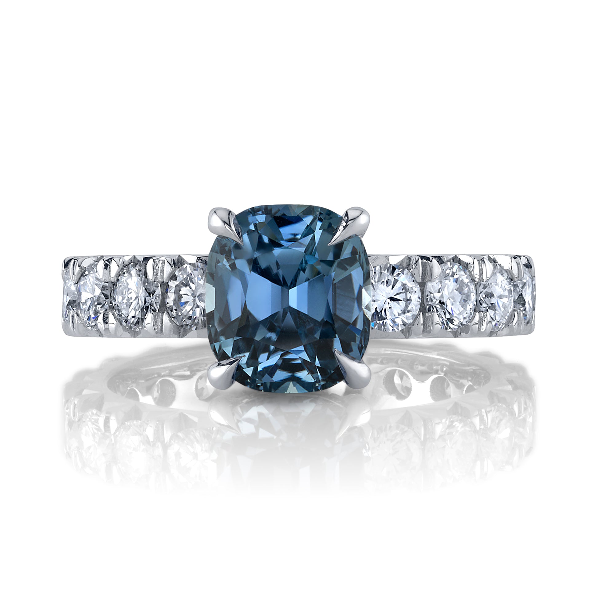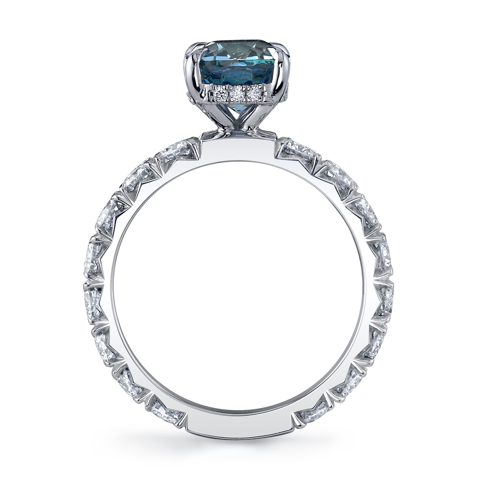 A stunningly grayish blue shade. Unheated Burma Origin Sapphire ring with a diamond foundation over 1.5 carats. Admire the setting detail in the side view image of the ring.
