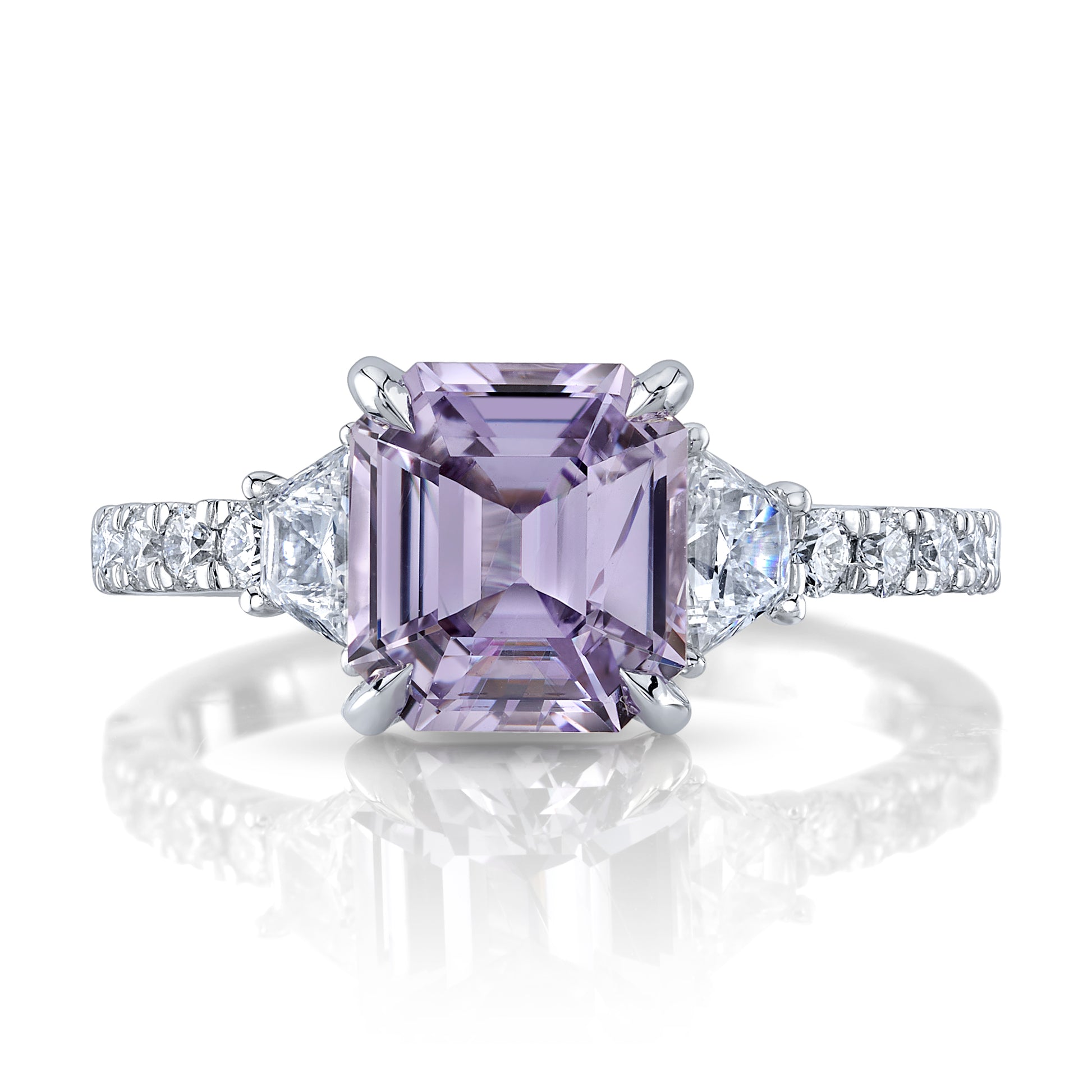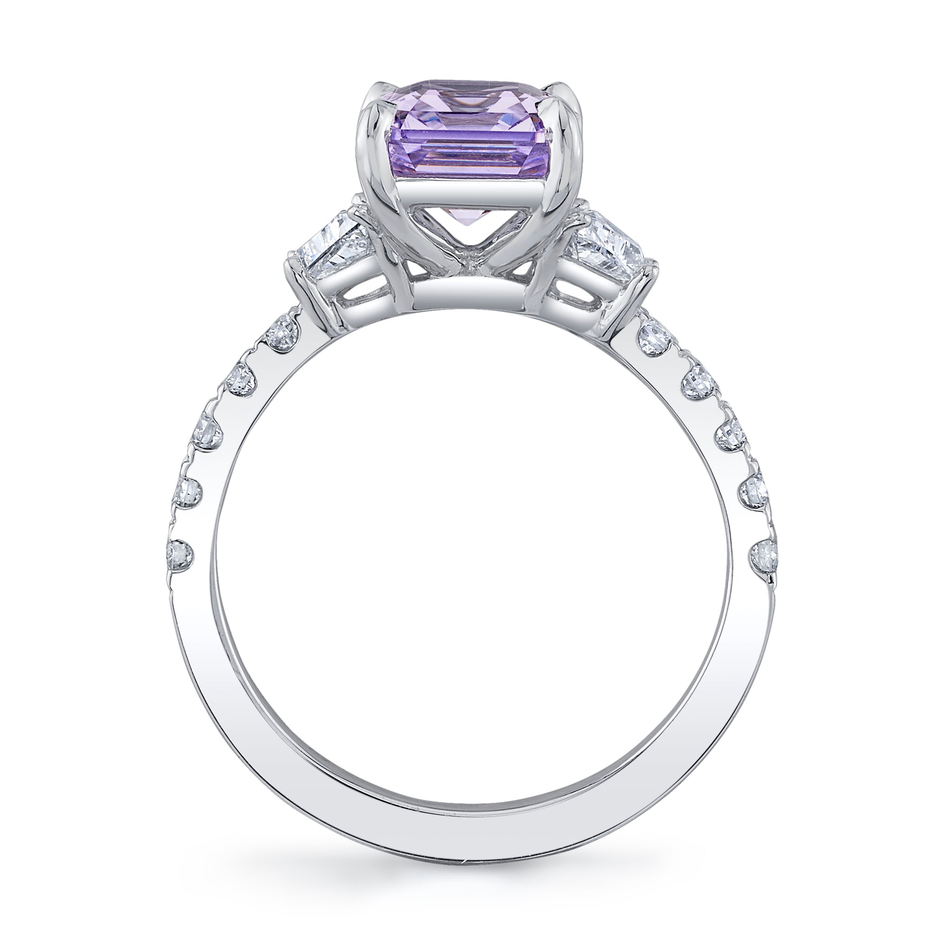 Blissful light purple color. Cut to perfection in the square step cut shape. Trapezoid and round shaped diamond create a stunning tapered design on the foundation.