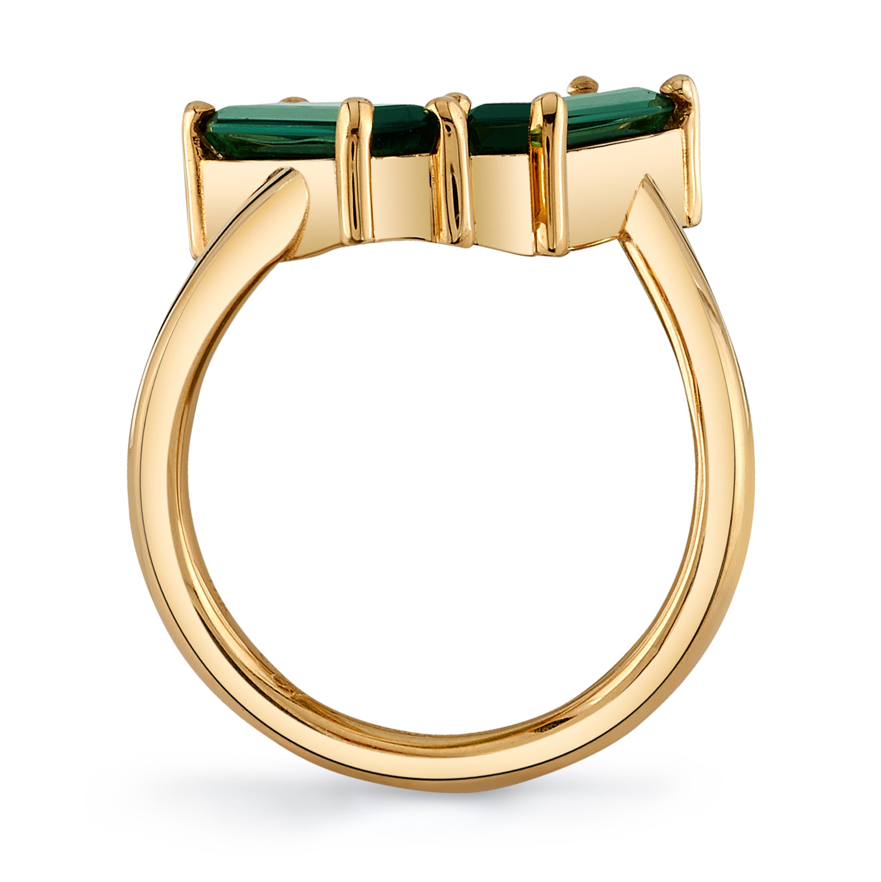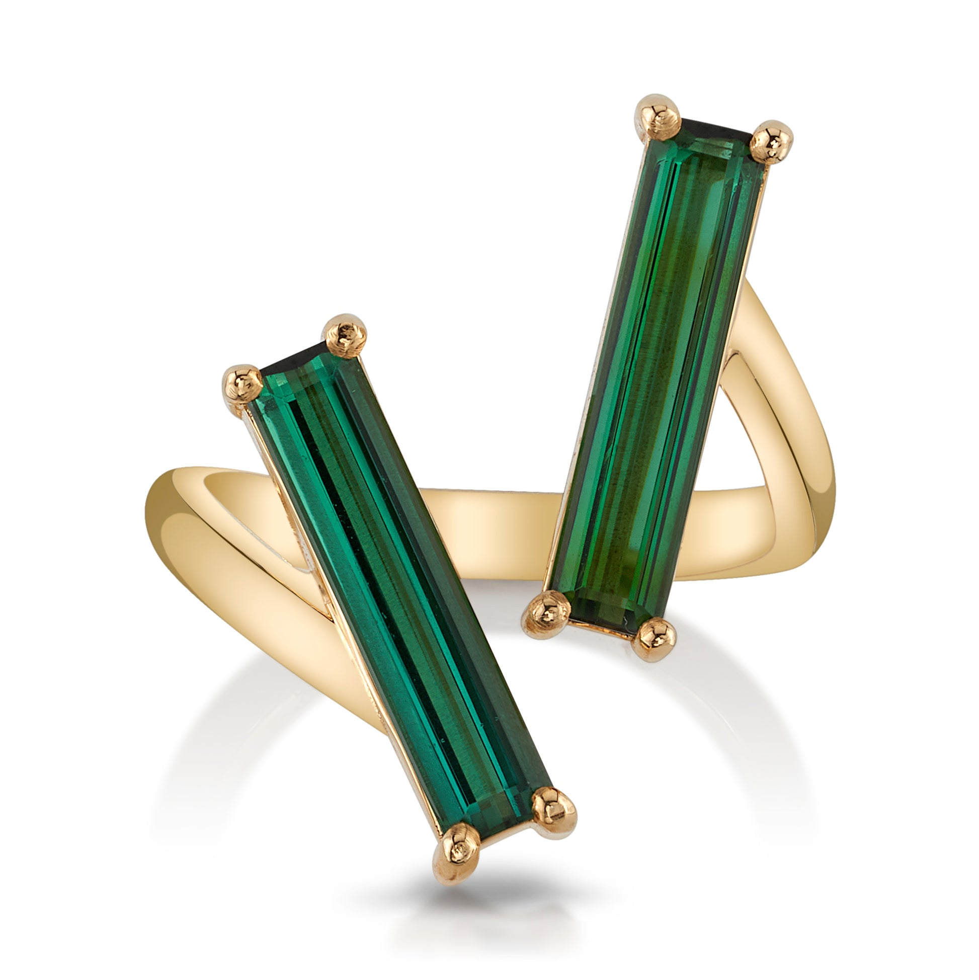 A matched pair of elongated cut rich green tourmalines. They are set assymetrically in a open ring design with heavy, buttery 18k yellow gold.