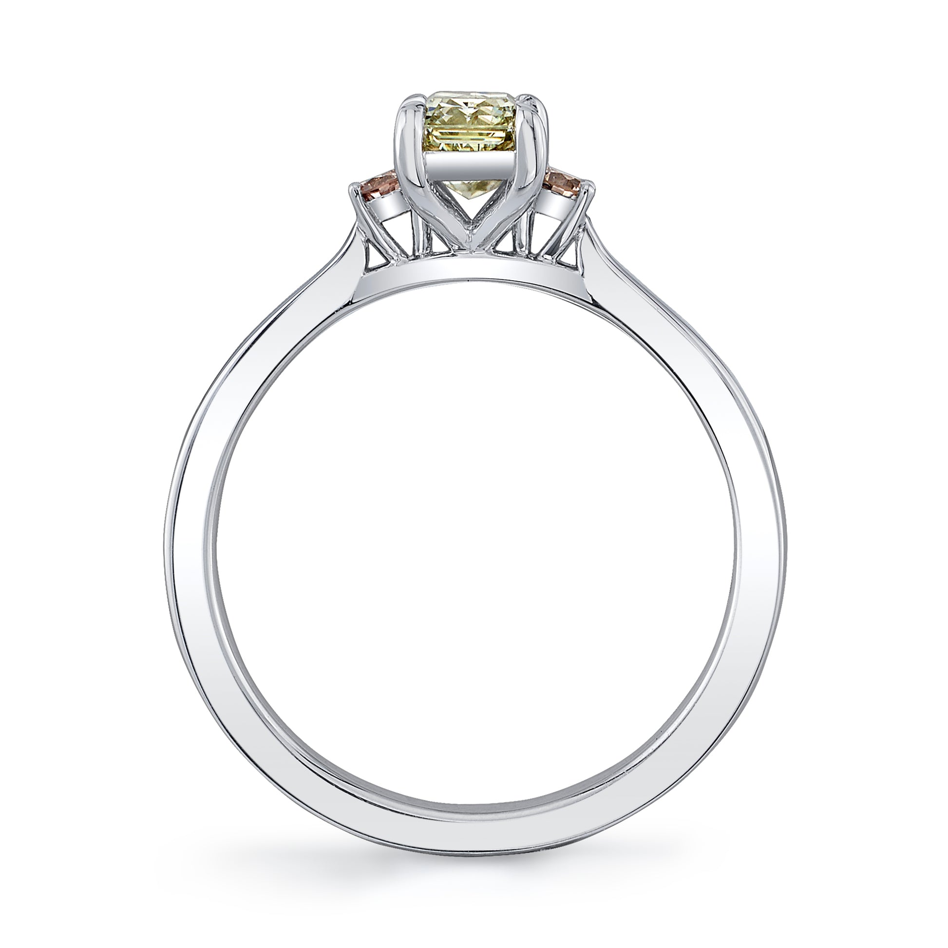 Natural color diamonds are always a joy to work with. Greens are particularly rare, we chose to accent it with a faint pink round diamond accent on each side. At just over a half carat for the center, this ring is dainty and delicate, but does not lack importance.