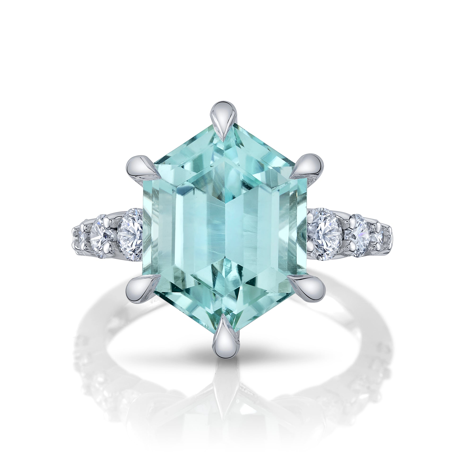 A cut rarely seen in Paraiba Tourmaline, a hexagonal step cut, at quite an impressive size. This tourmaline is a hair lighter than the prized sea foam shade, however it is a very pleasant Greenish Blue color assigned by GIA on the report.