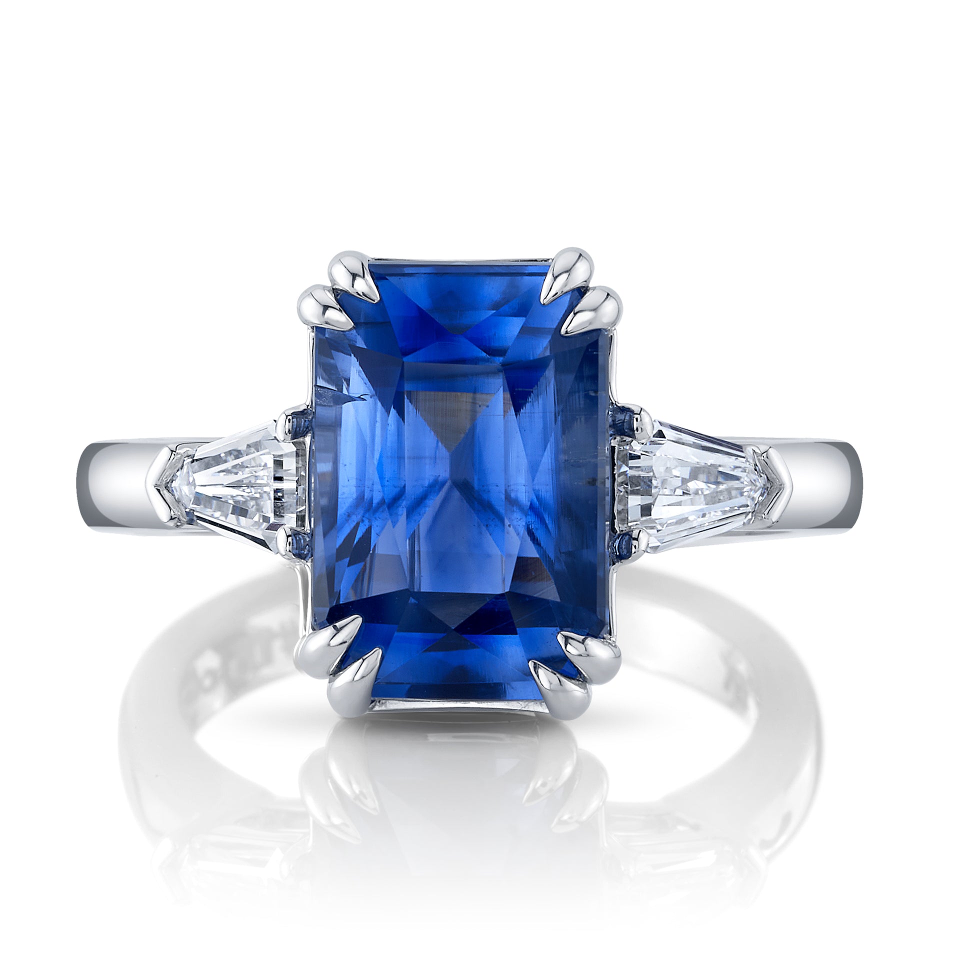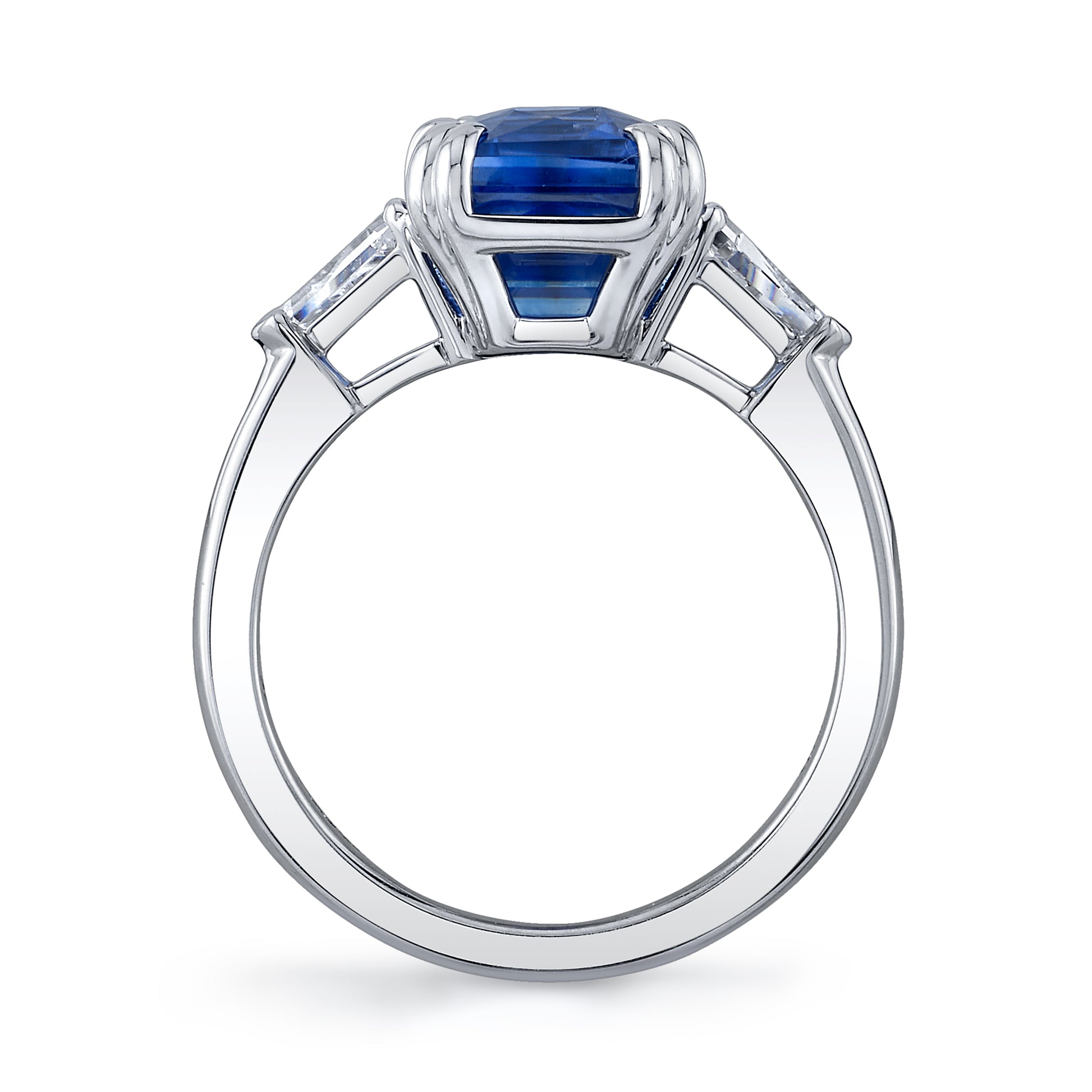 7.24ct CD No Heat Blue Sapphire Three Stone Ring. D VVS1 bullet shaped natural diamond accents. Crafted in 18k white gold.