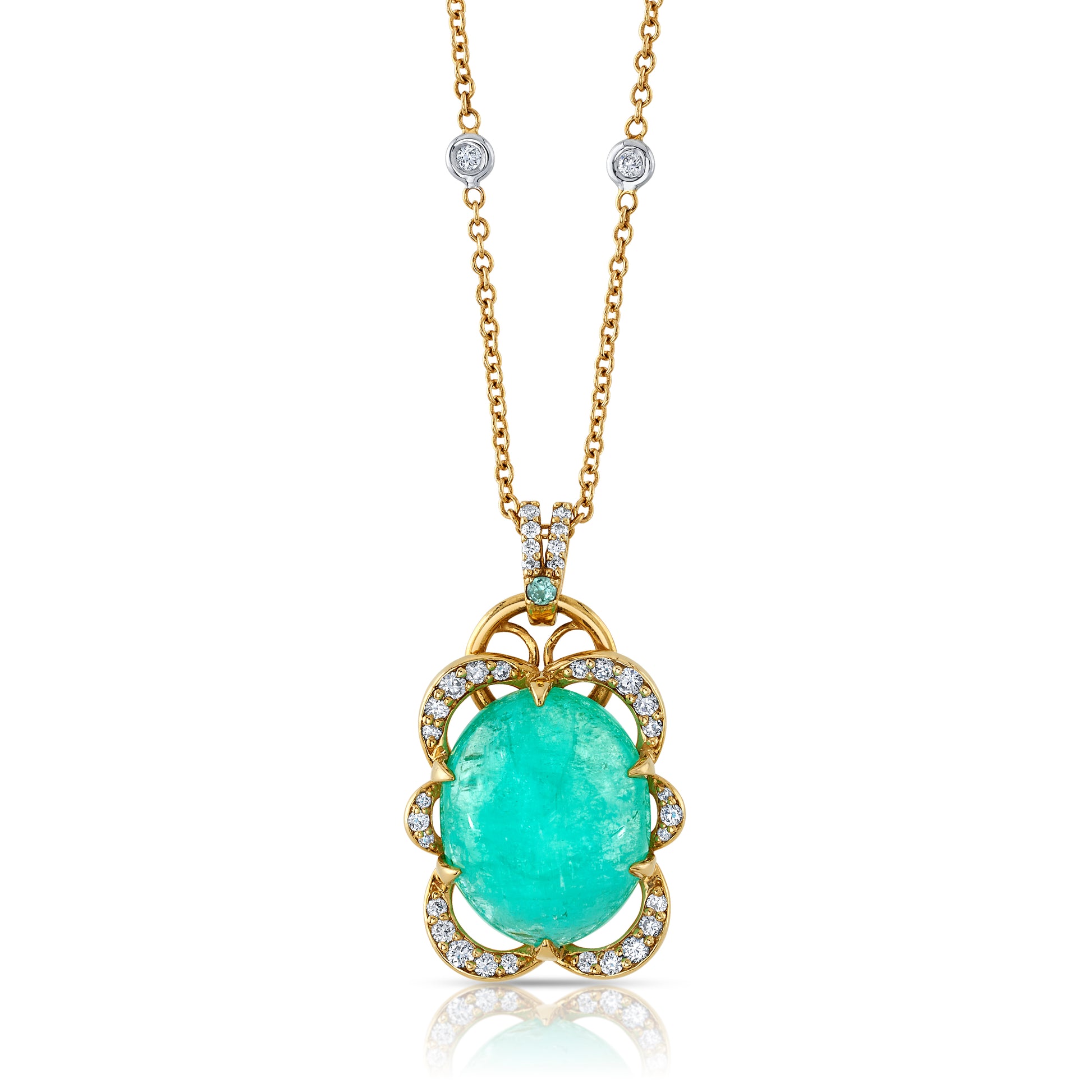 7.49ct Paraiba Tourmaline Cabochon Cut Pednant Necklace with diamond and alexandrite accents.