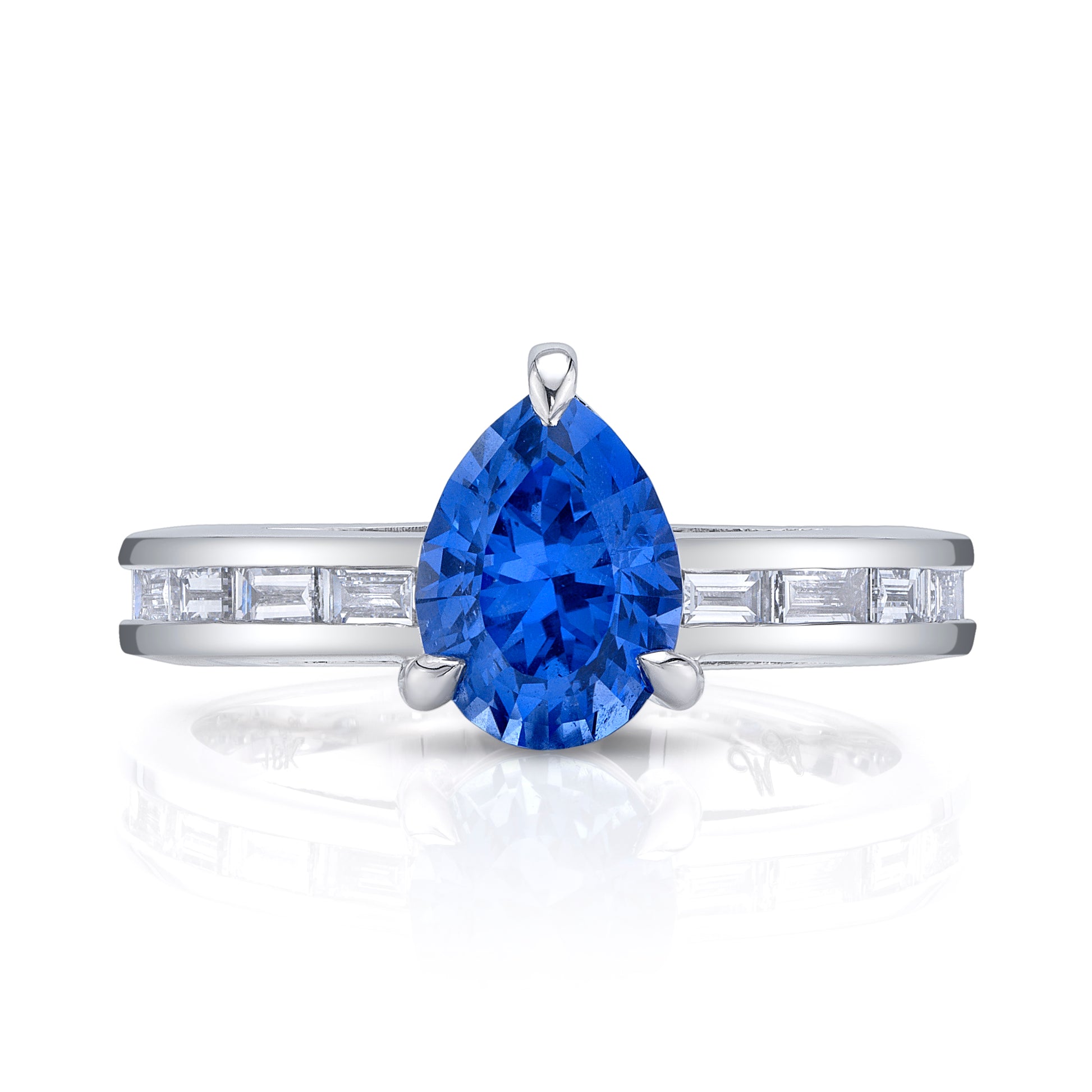 2.46ct AGL Prestige Report Certified Pear Shape Burmese Sapphire ring in 18k white gold with .77cts of colorless baguette diamonds.
