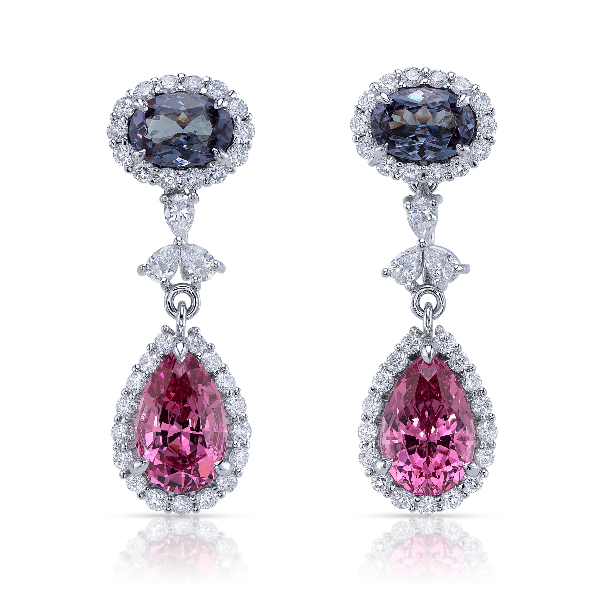 4.1cts total weight in untreated pear shape pink spinels and 1.72cts total weight in color changing oval garnets and 1.19cts in total diamond weight drop earrings in 18k white gold.
