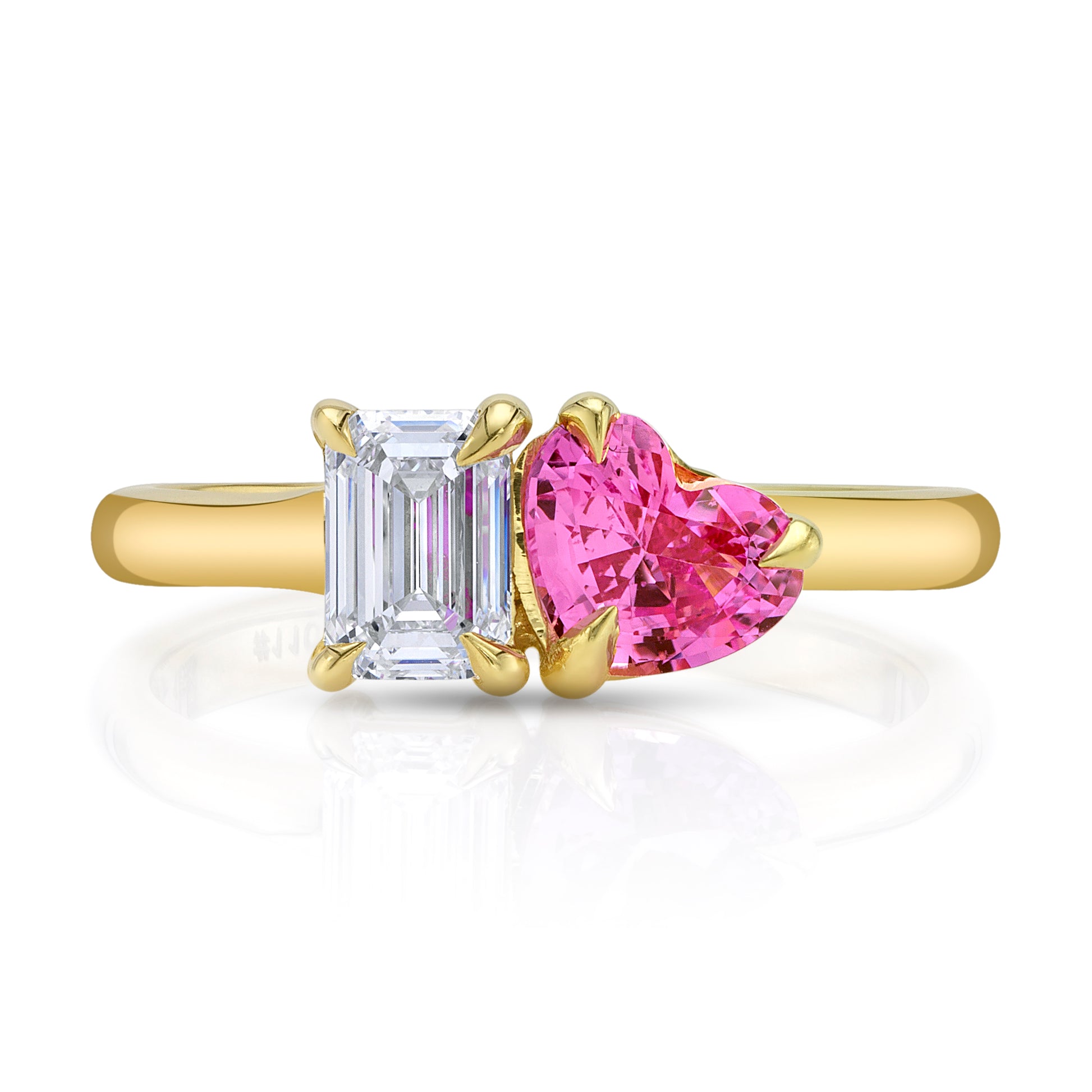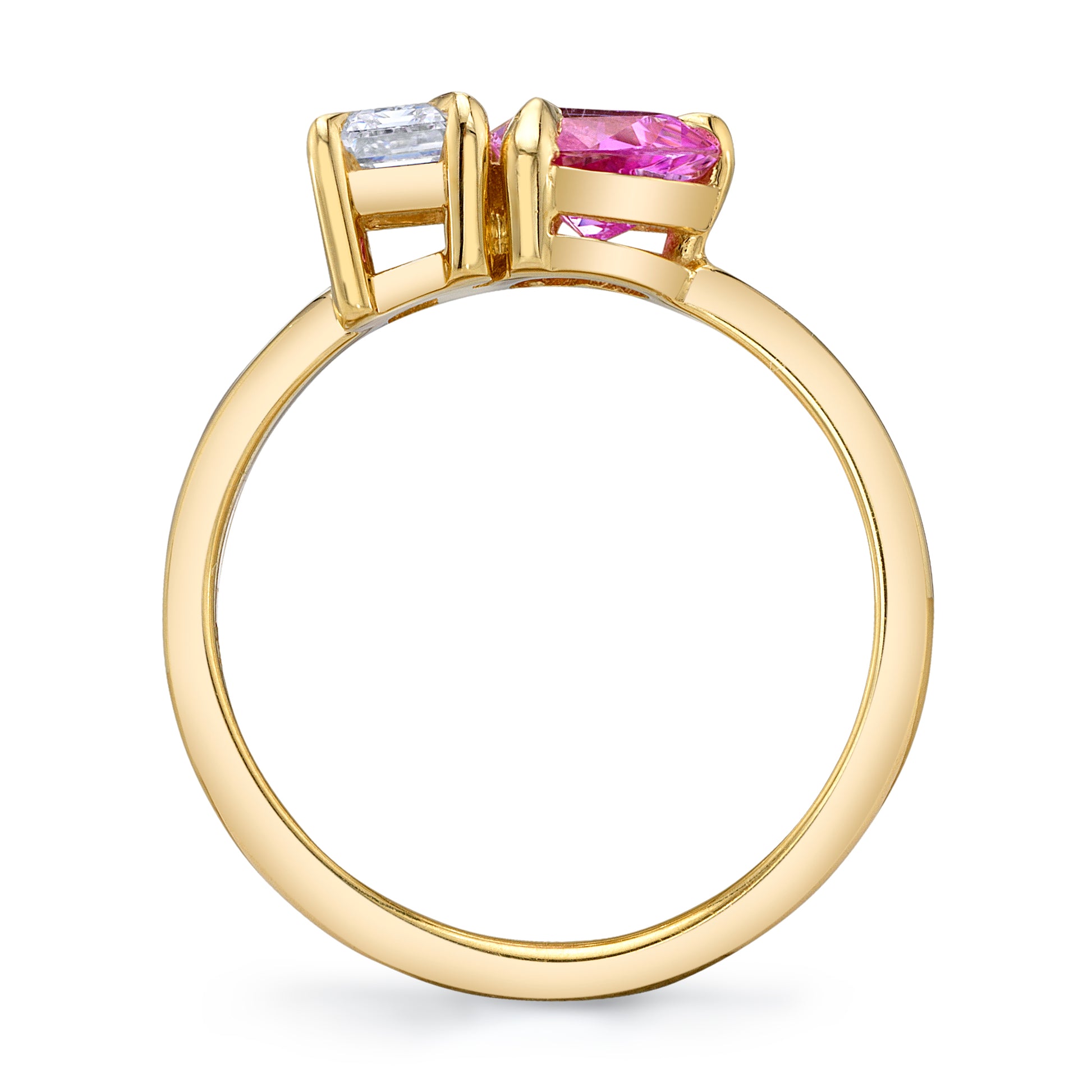Emerald cut Diamond and No Heat Pink Sapphire Two-Stone Ring in 18k yellow gold.