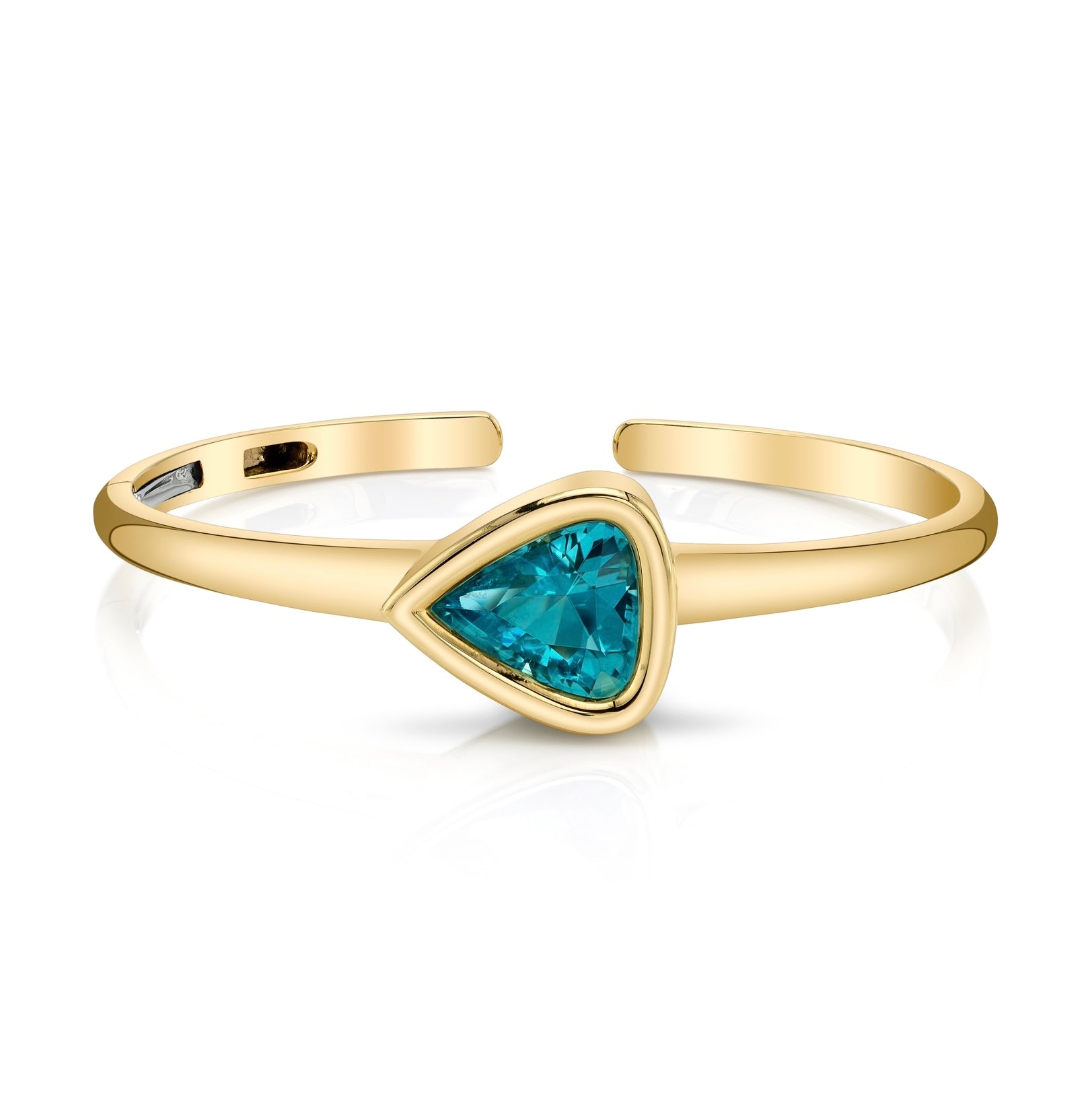 “Chubby pear” shaped untreated blue tourmaline just under 9 carats. This shape and color are so unique, we wanted to truly highlight the gem and let it stand alone. We set this in a fully solid 18k buttery yellow gold bangle, with a hinged clasp and extra chunky bezel.