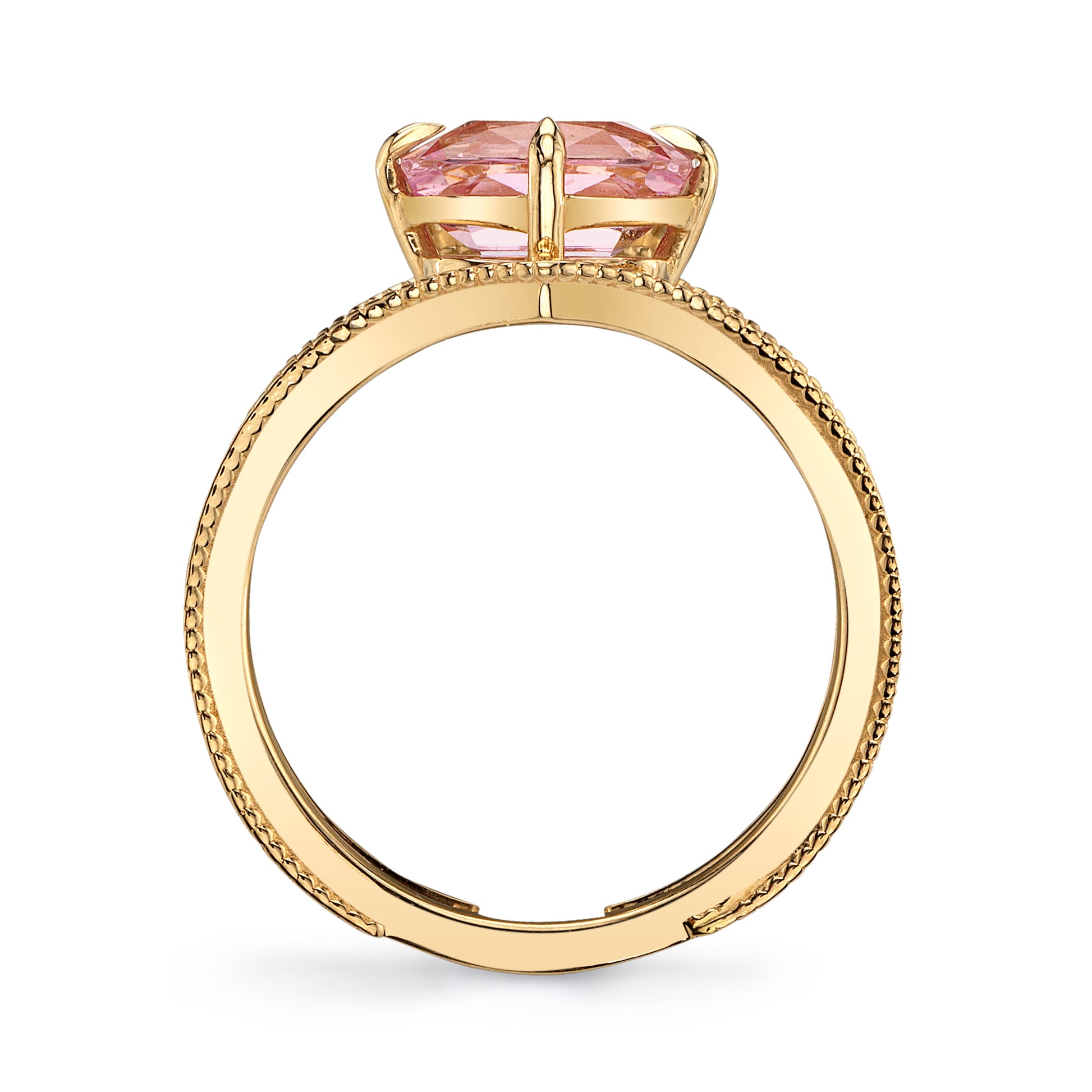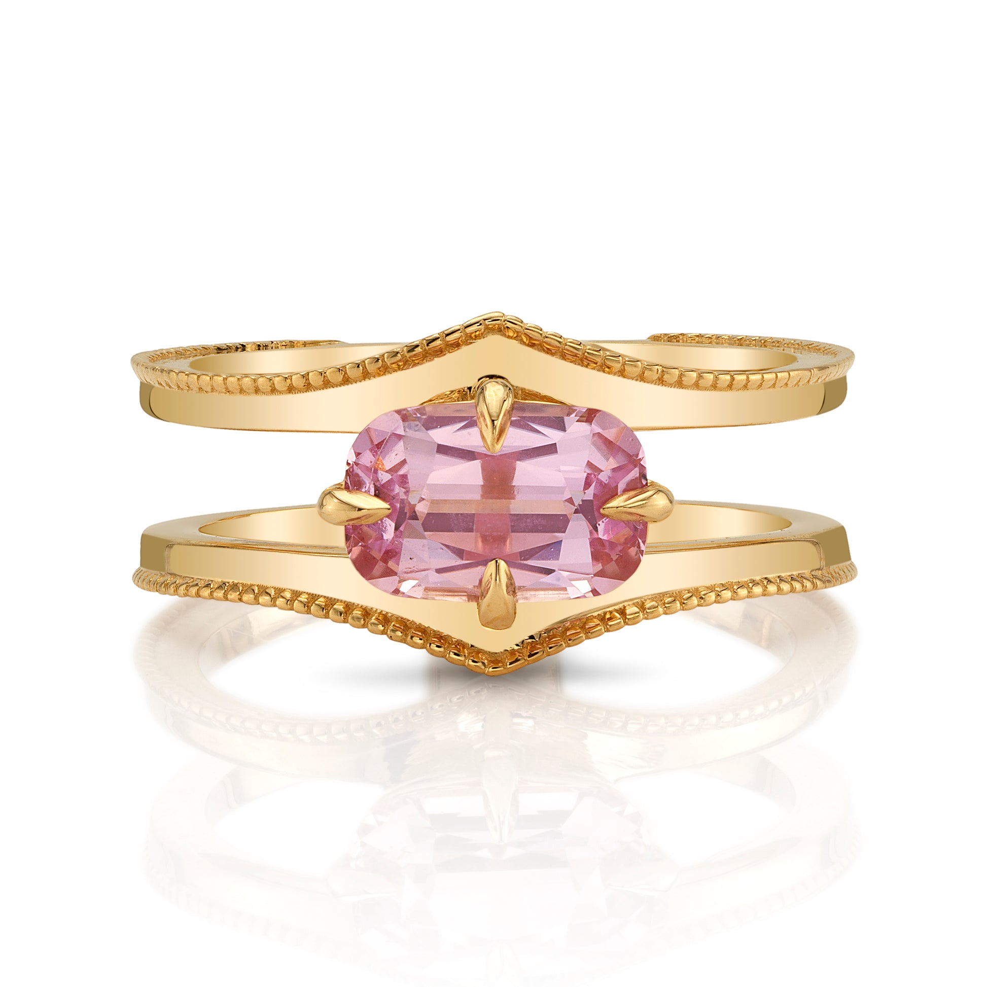 This 1.86ct Sapphire from Sri Lanka is the perfect baby pink color. Unheated pink sapphires in high quality are increasingly difficult to come by. We wanted to highlight the exceptional cutting and crystal of this gemstone by creating a solitaire design.
