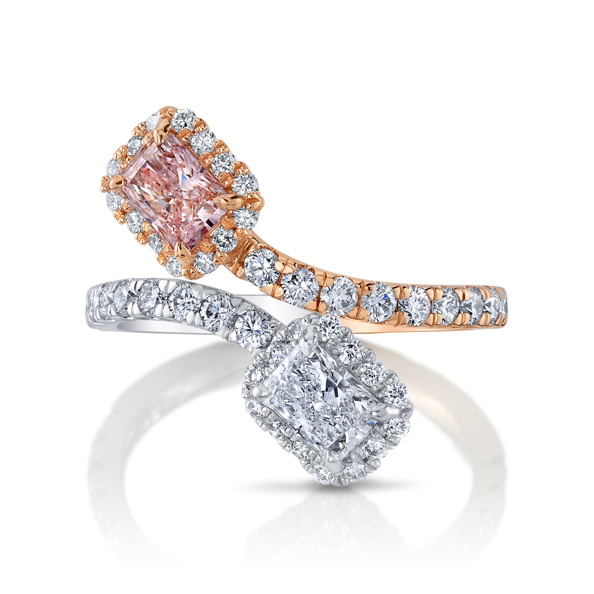 Natural Pink and White Diamond GIA certified bypass ring. Crafted in 18k rose and white gold.