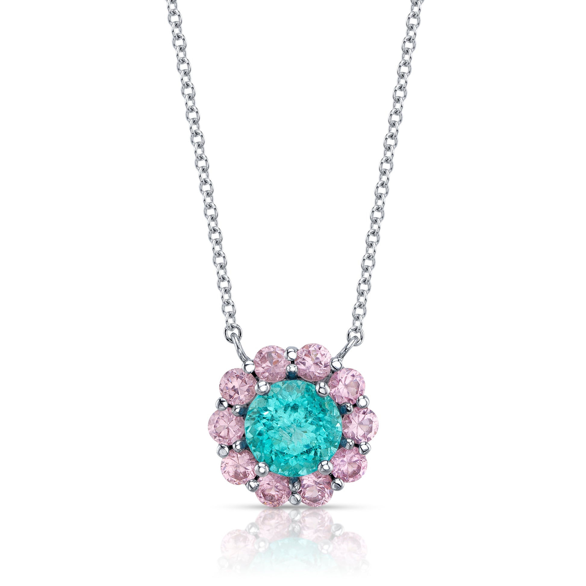 Natural GIA Paraiba Tourmaline and Spinel Halo necklace in 18k white gold.