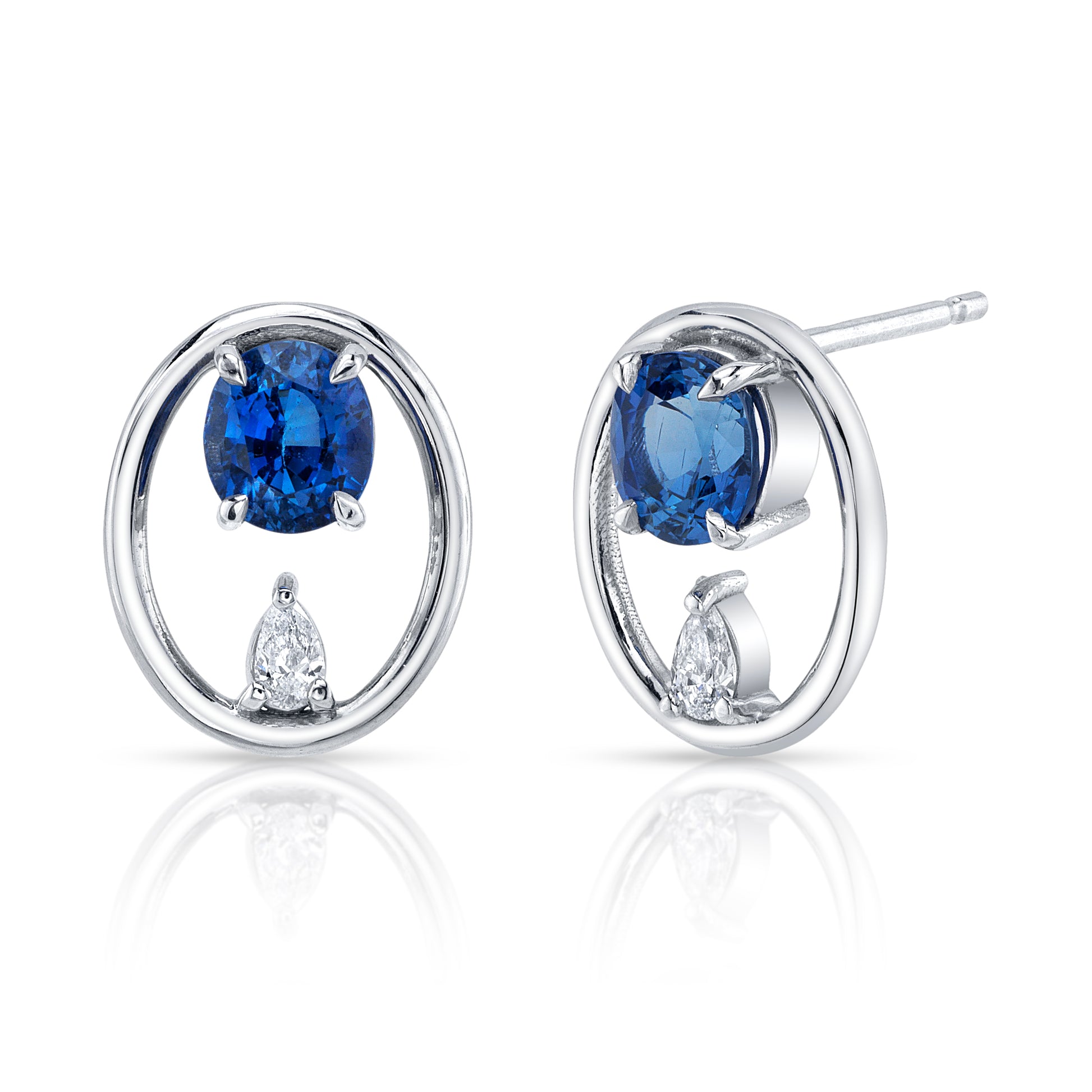 Beautiful matched pair of unheated blue sapphires, weighing 1.26cts from Sri Lanka. They are set opposite pear shaped diamonds, weighing .08cts. This modern design is striking and easy to wear.