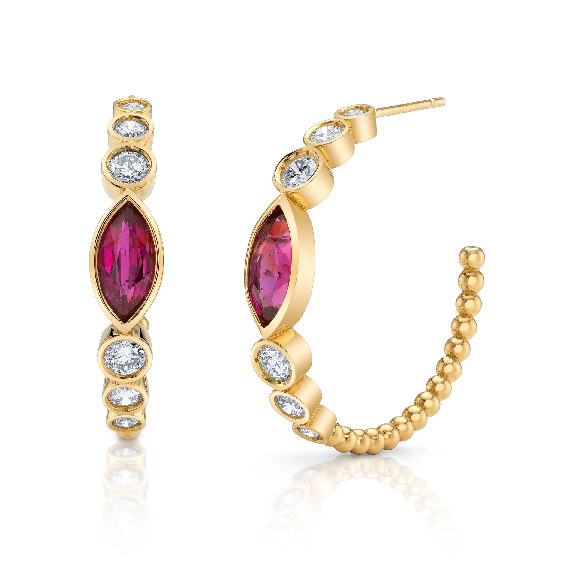 No Heat GIA Marquise Ruby and Diamond Hoops set in 18k yellow gold bezels.
