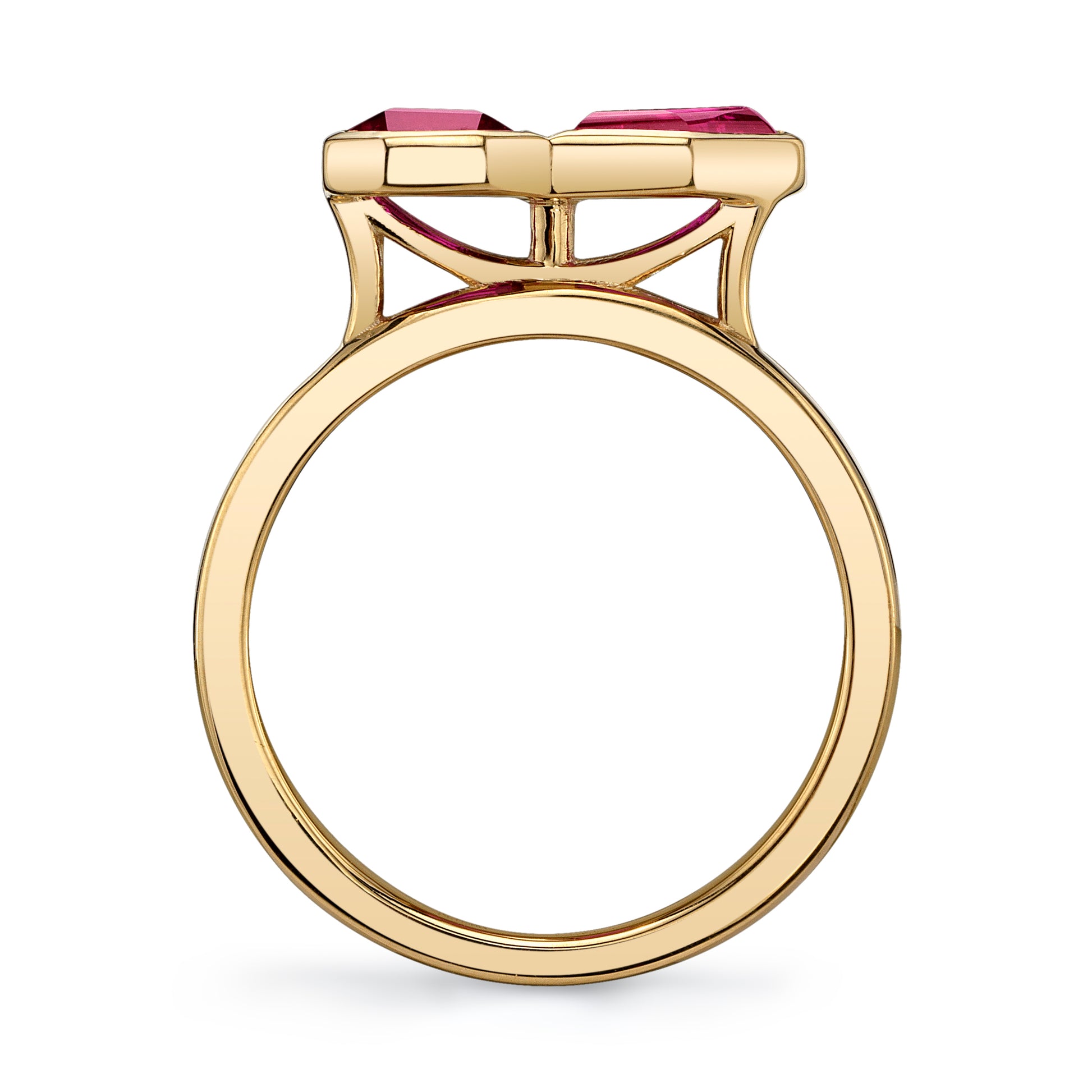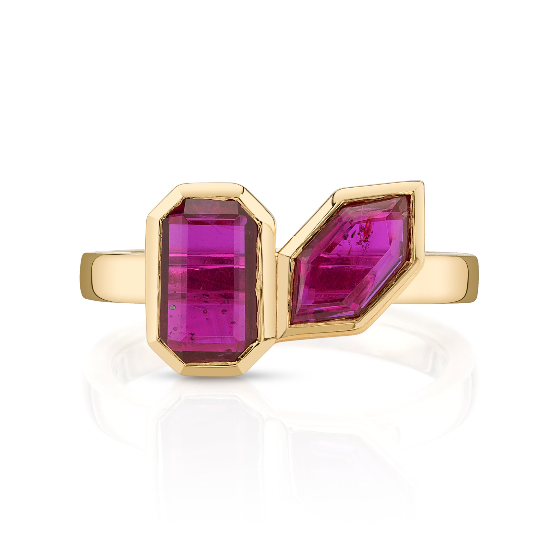 A combined 2.22cts of untreated portrait cut rubies are bezel set in this unique conversation piece. Both rubies are from Mozambique, and are a beautiful pinkish red hue. The emerald cut is 1.32cts, and the duchess cut is 0.90cts. The side profile is stackable, and is a blank canvas to play with diamond and ruby straight bands.