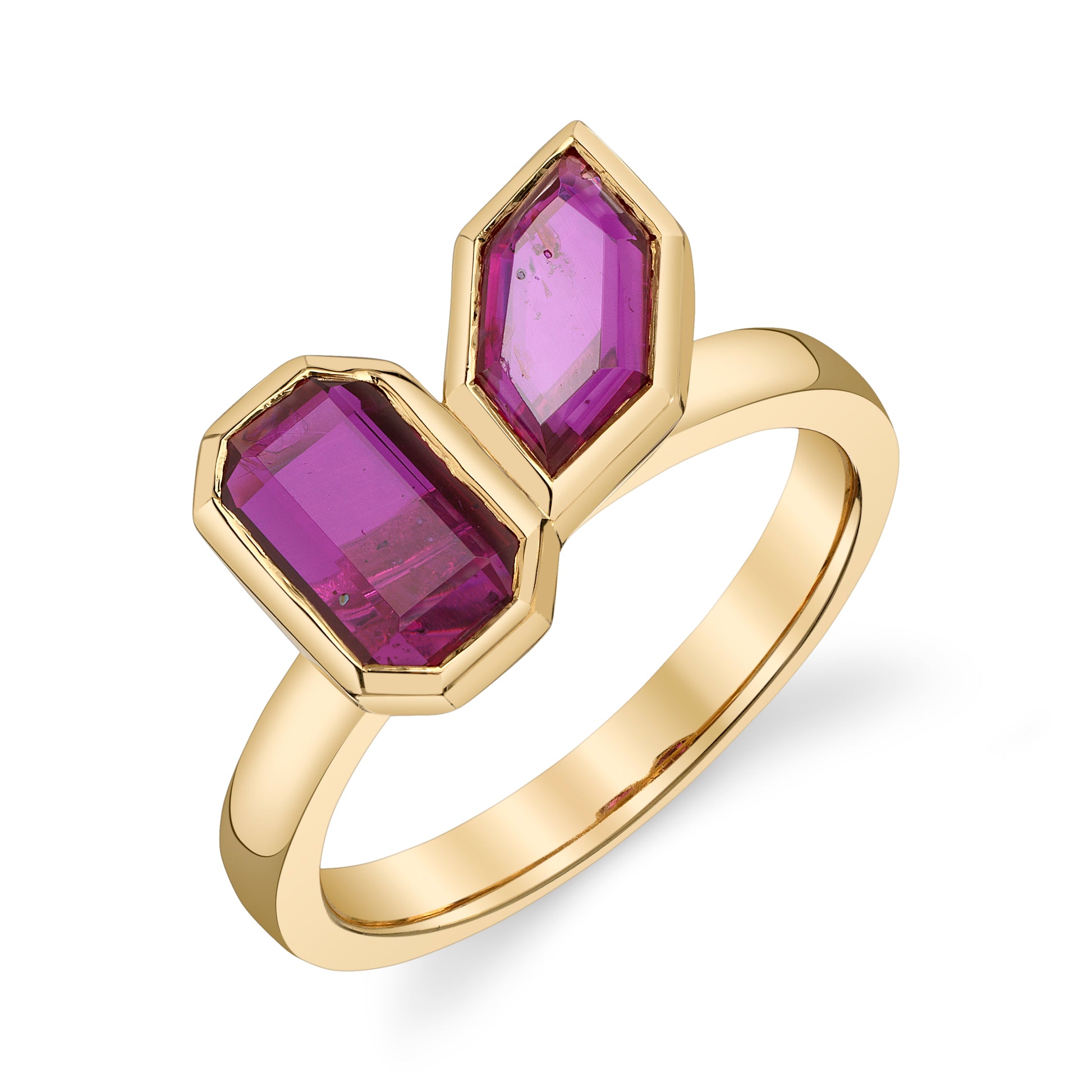 No Heat Mozambique Ruby Two Stone Ring set in 18k yellow gold.
