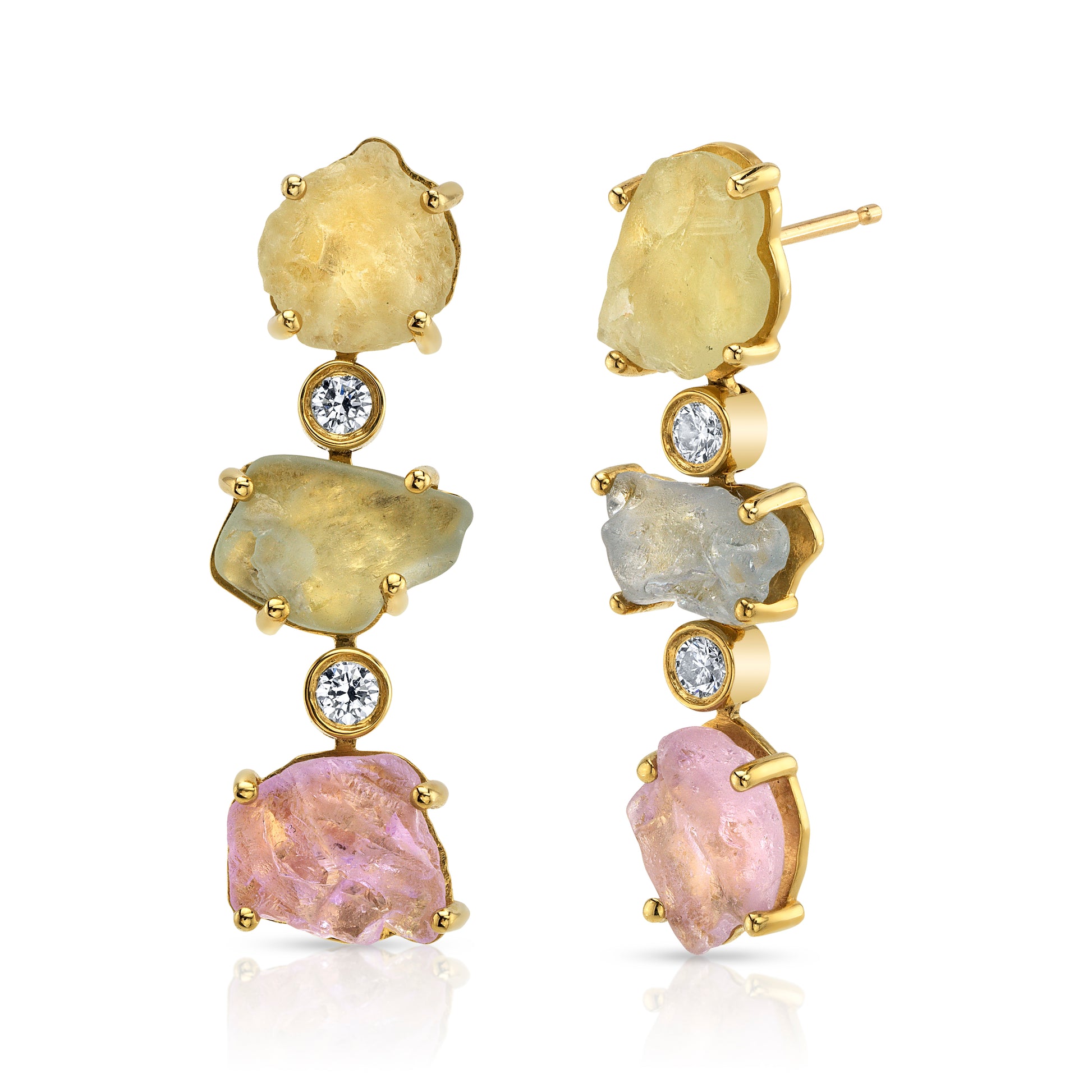 We purchased a parcel of over 50 carats of rough sapphires fro Sri Lanka, these are uncut sapphires that have not been faceted. Their organic shape offers a totally unique look, they are unheated and have incredible natural pastel color tones. This pair of drop earrings is of course one of a kind and ready to be your daily grab and go earrings.