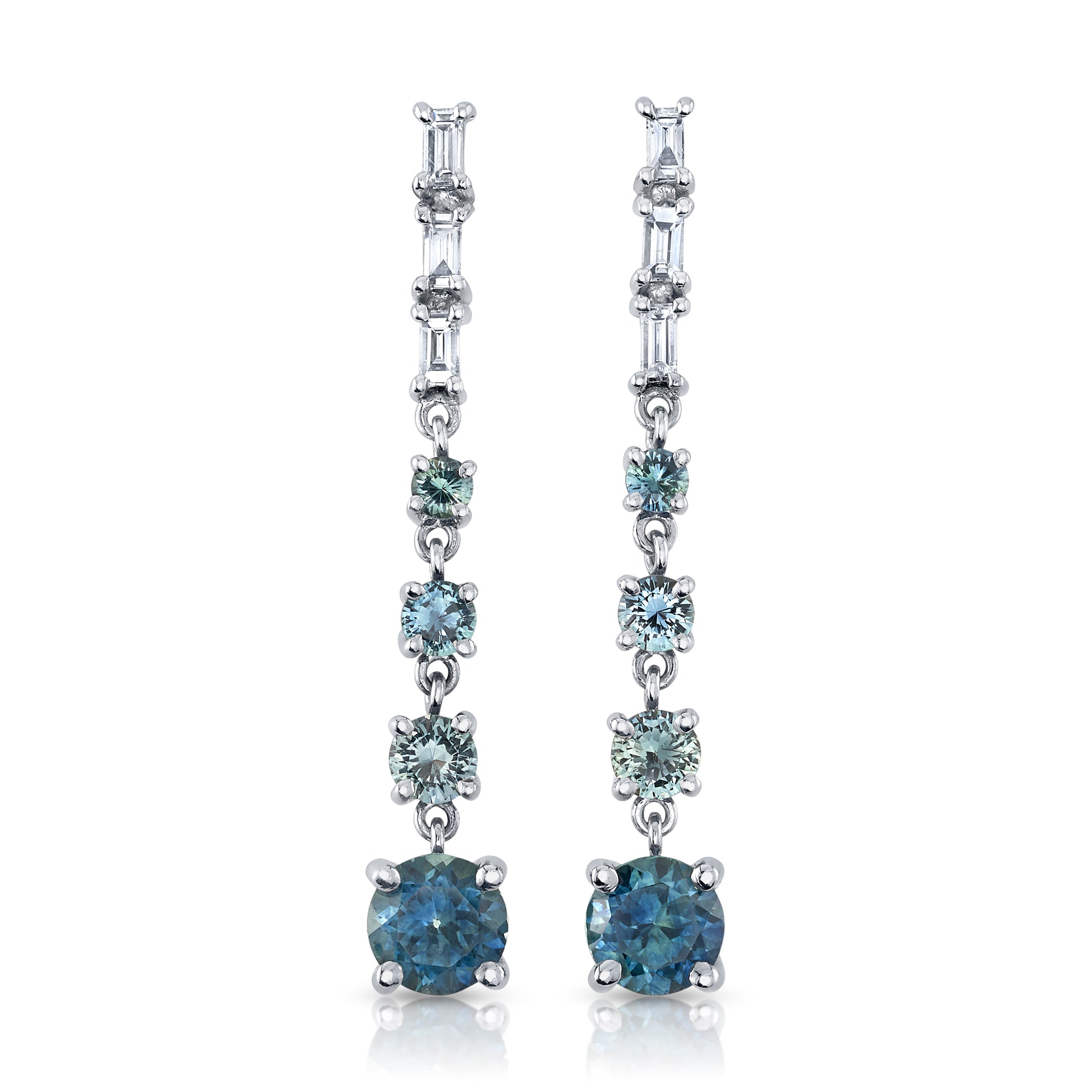 Teal Gradient Sapphire Dangle Earrings crafted in platinum with baguette diamonds.