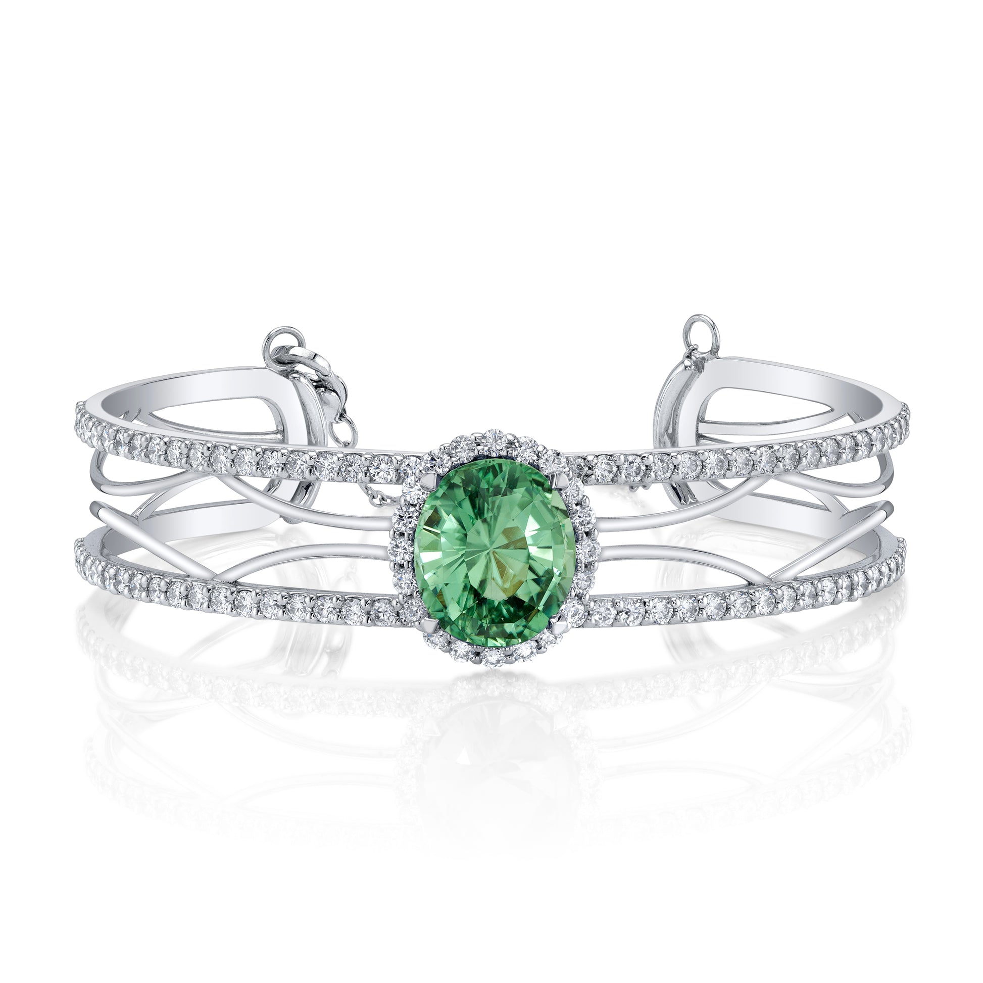 A one of a kind bangle, the bright green tourmaline is a stunning color and crystal quality. This piece has contemporary design elements with the arched wire work connecting the two rows of diamonds. Sure to be a show stopper at your next special event.