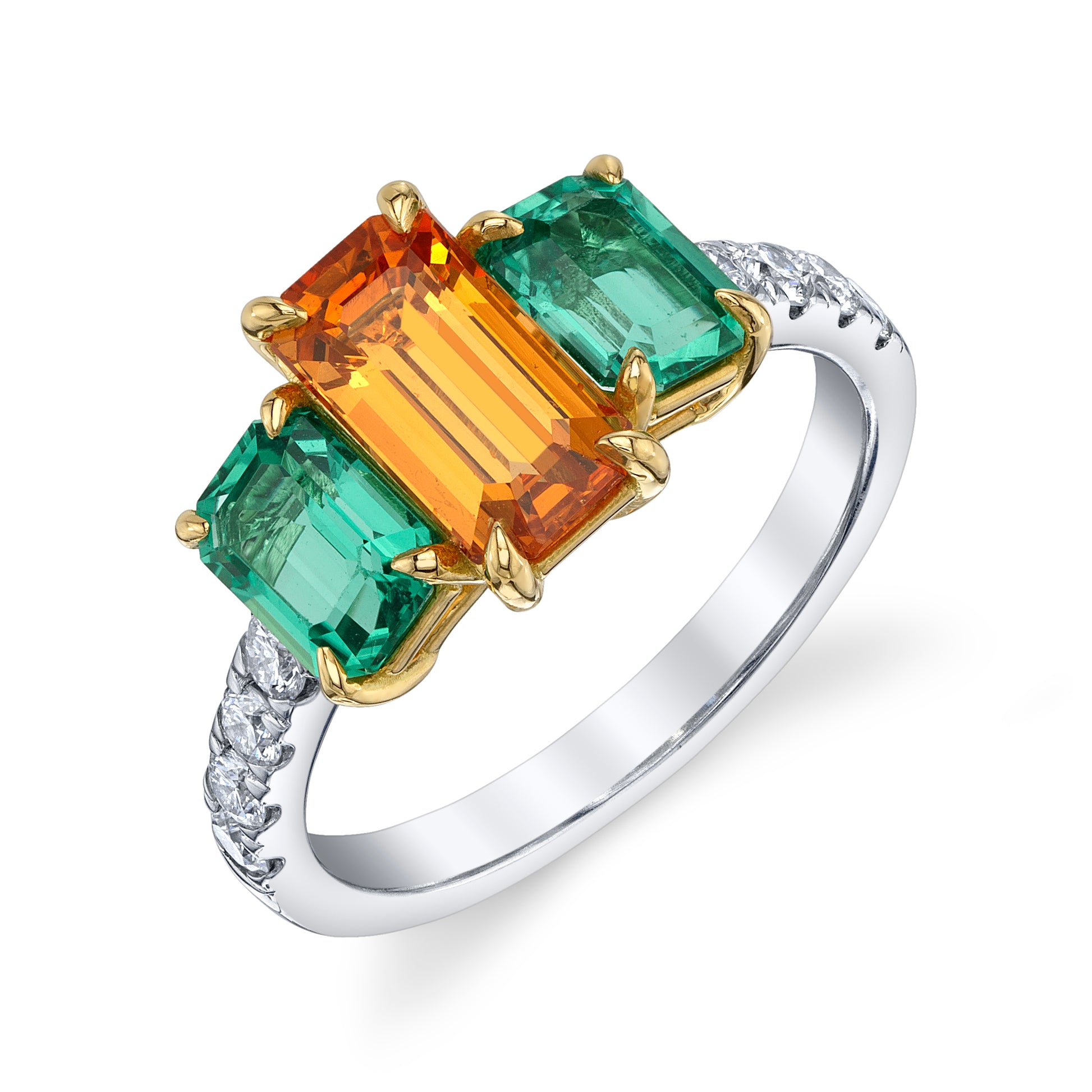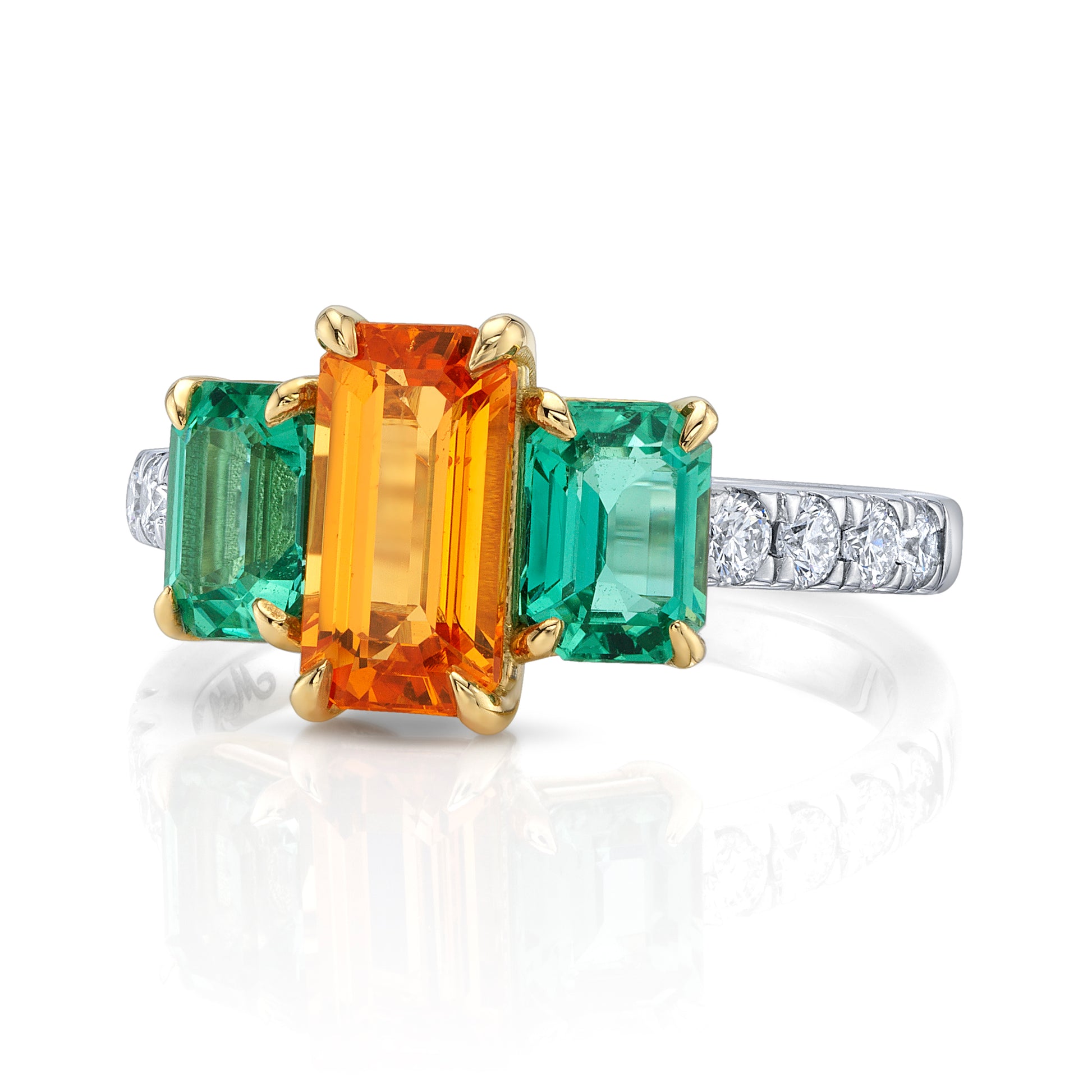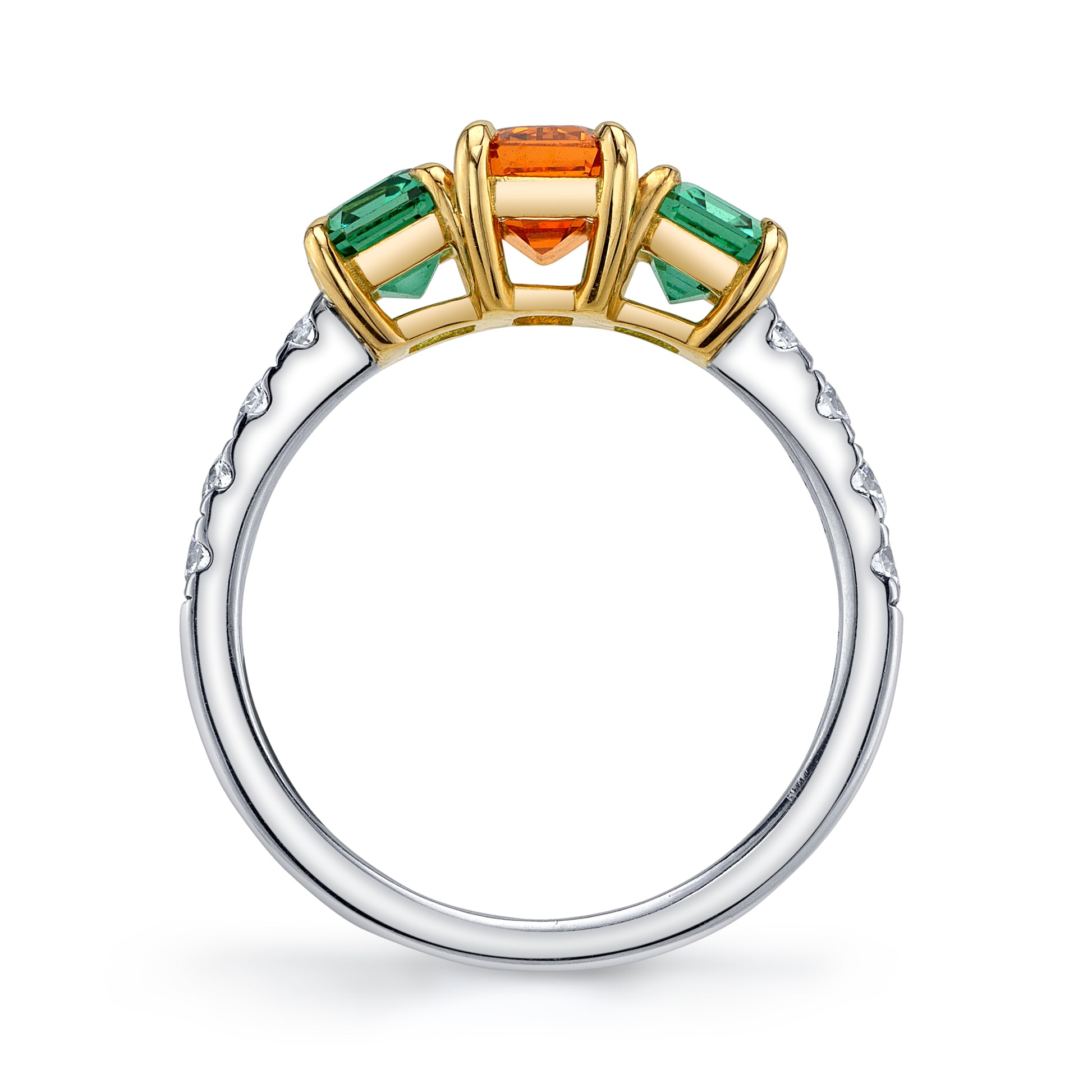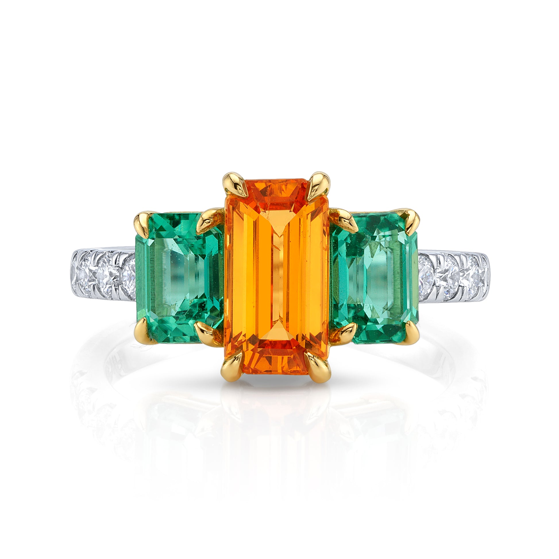 While it may not be for everyone, this splash of vibrant colors mixed together is bold and beautiful. We purchased the matched pair of lagoon tourmalines and later found this incredible orange emerald cut garnet. We instantly knew this needed to be set in a three stone ring. The garnet weighs 2.02cts, and the green tourmalines weigh 1.50cts together.
