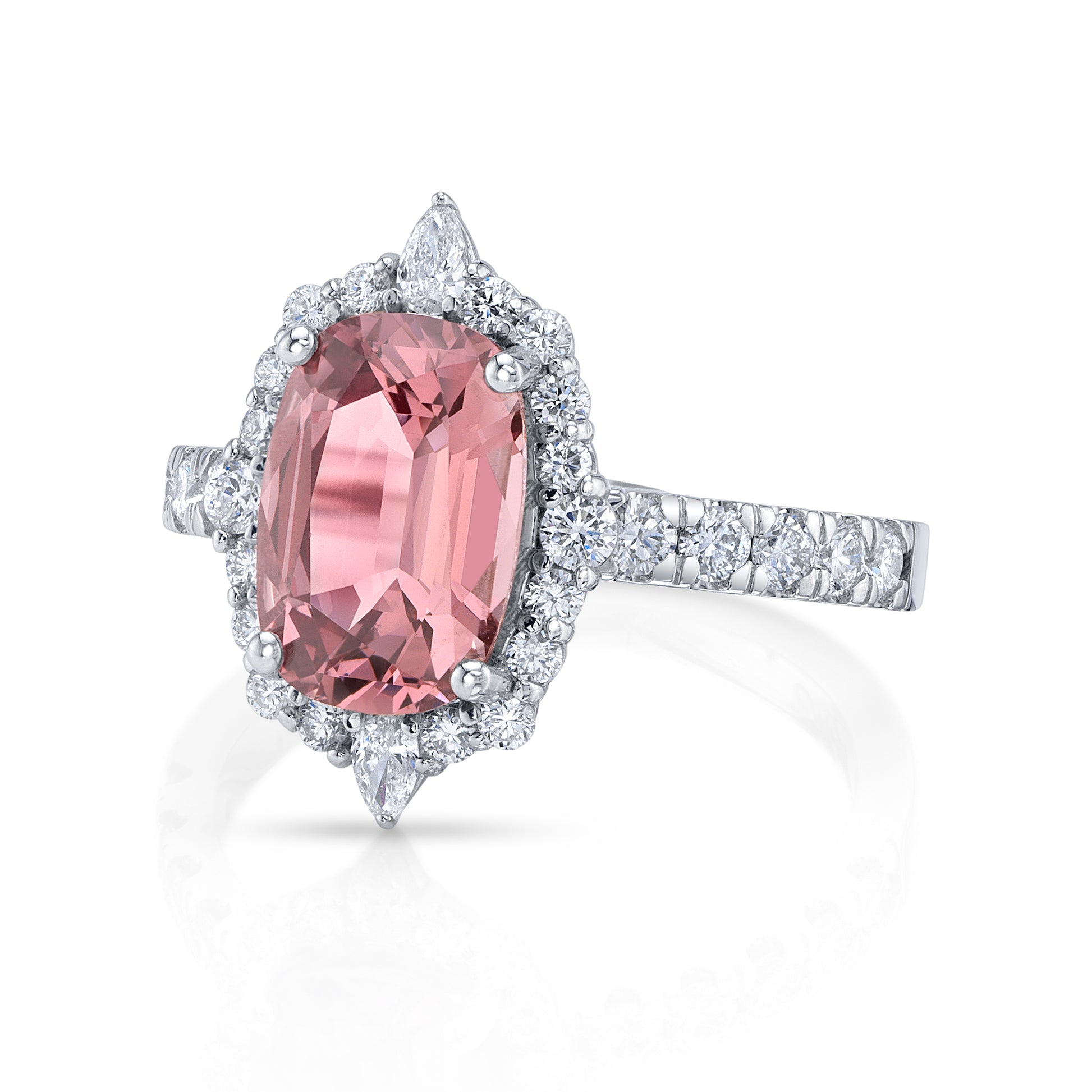 A classic MA design with pear shape and round diamonds in the halo to accentuate this dramatic elongated cushion shape. Spinel comes in a wide array of hues and colors, and this peach color is pleasing soft pink with oranges.
