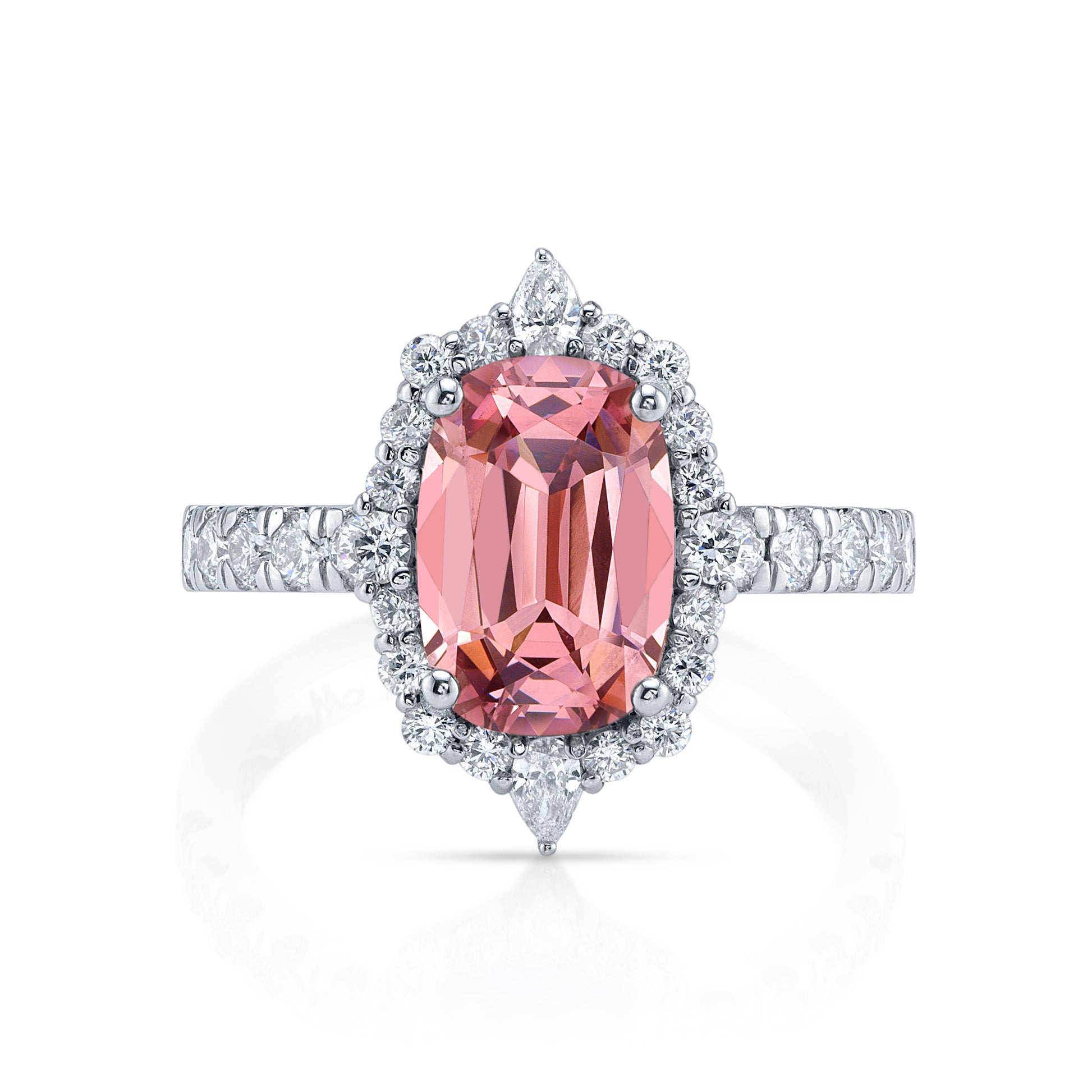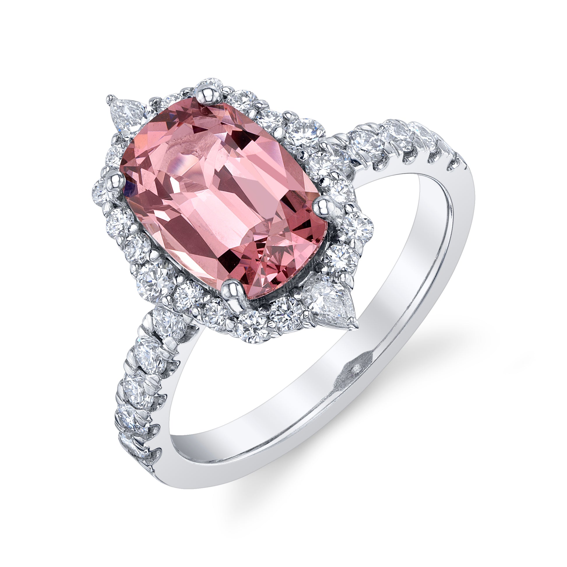 18k white gold 2.69ct elongated cushion peach spinel ring with 0.70cts of F VS diamond accents.