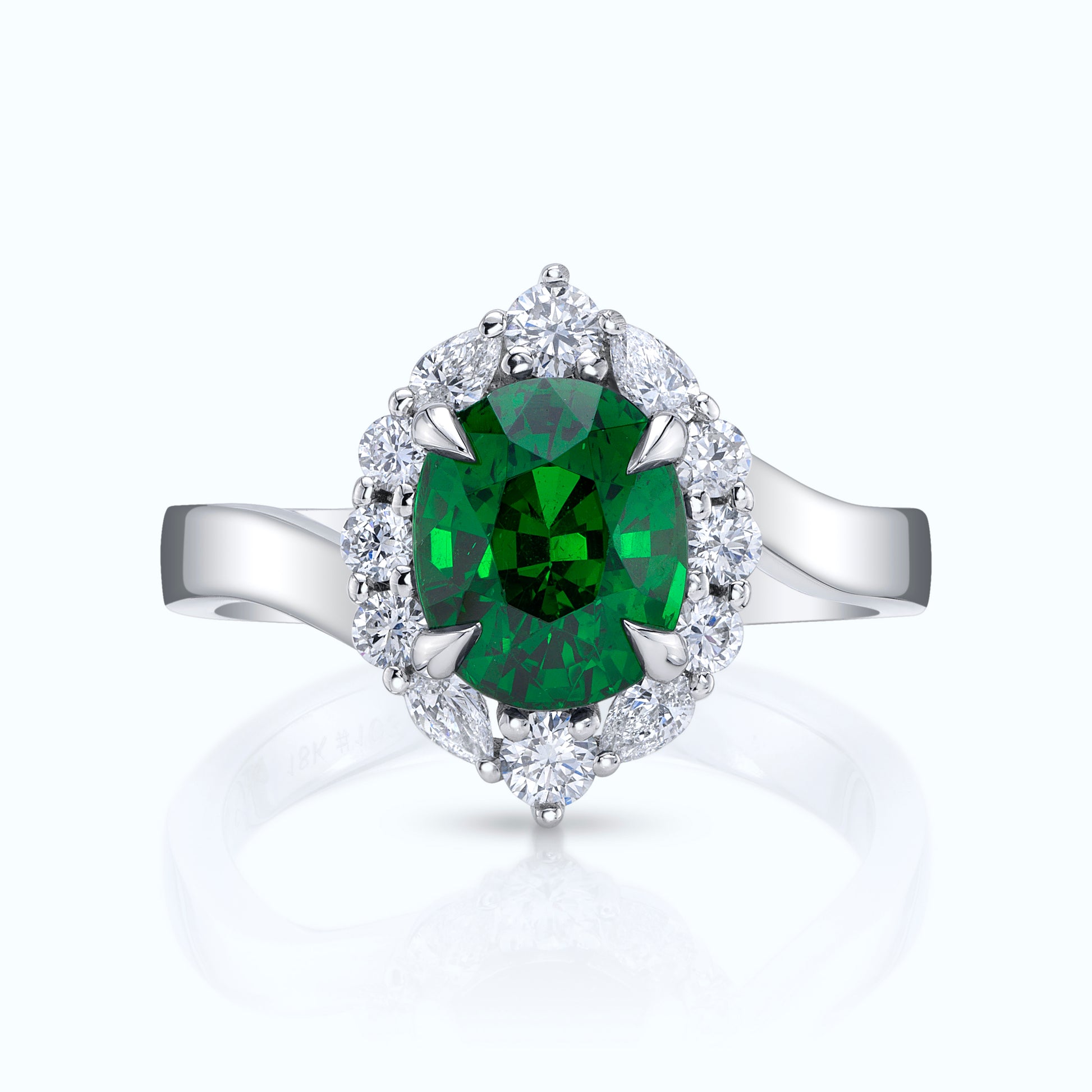 Tsavorite garnet is one our personal favorites. In person the green hue is captivating, and their rarity is admired by the industry. The halo is rather complex, featuring multiple sizes of round brilliant diamonds and 4 pear shaped diamonds perfectly tucked in. The foundation of the ring has a subtle sweep to it, wrapping around the precious Tsavorite.